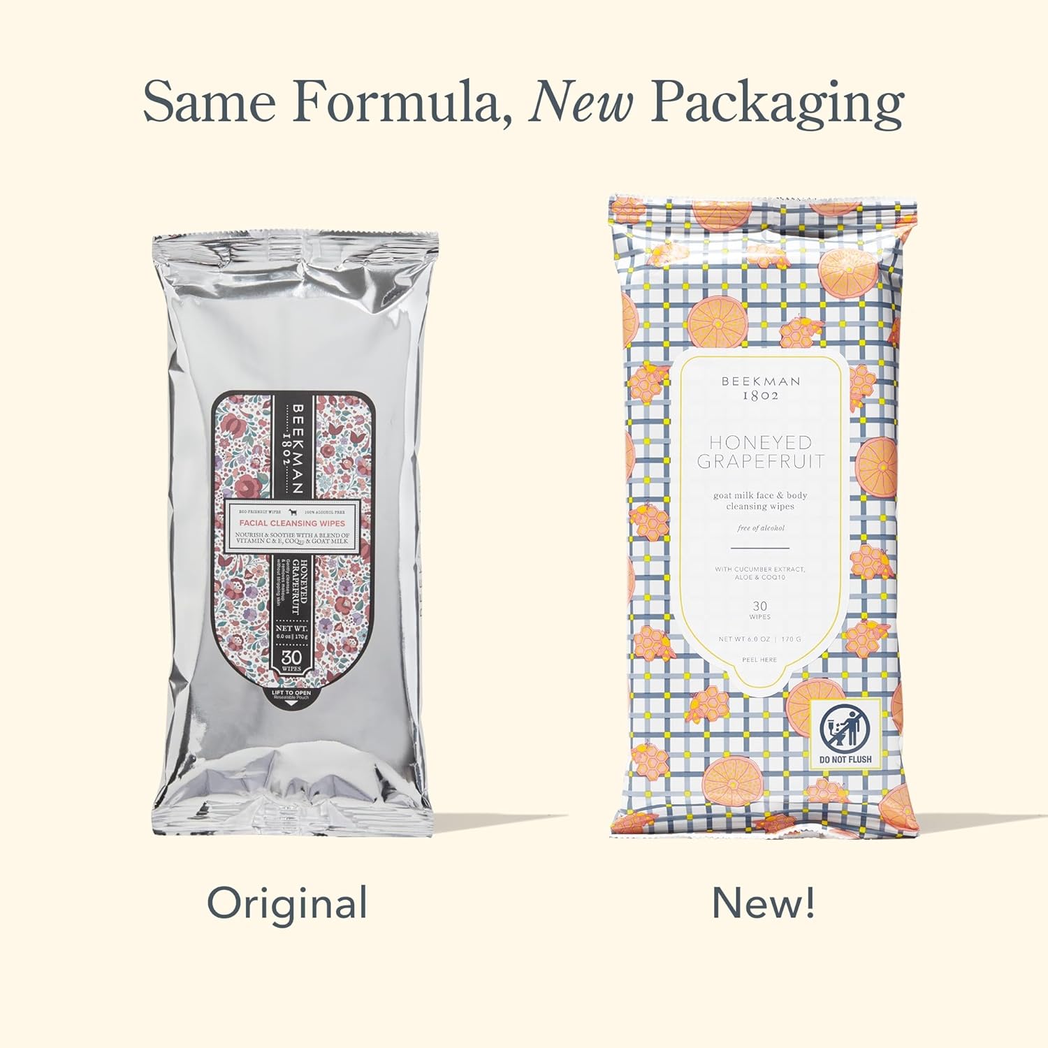 Beekman 1802 Face & Body Wipes, Honeyed Grapefruit - Scented - 30 Count - Cleanses - With Goat Milk, Aloe & Vitamin E - Alcohol Free, Biodegradable - Packaging May Vary