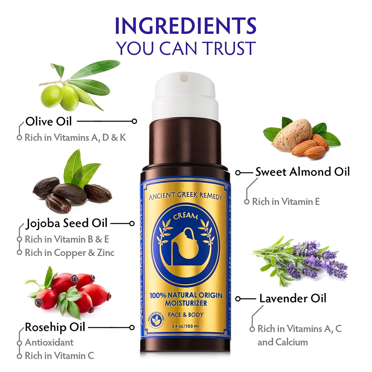 - INGREDIENTS YOU CAN TRUST - Organic anti aging moisturizer made of 100% cold-pressed oils, including Organic Extra Virgin Olive oil, Sweet Almond oil, Jojoba oil, Castor oil, Grapeseed oil, Sunflower oil, Vitamin E oil, & Lavender Essential oil. Vegan, non-GMO. It is 100% free from water, preservatives, Parabens, gluten, fillers, artificial scents, and chemicals.