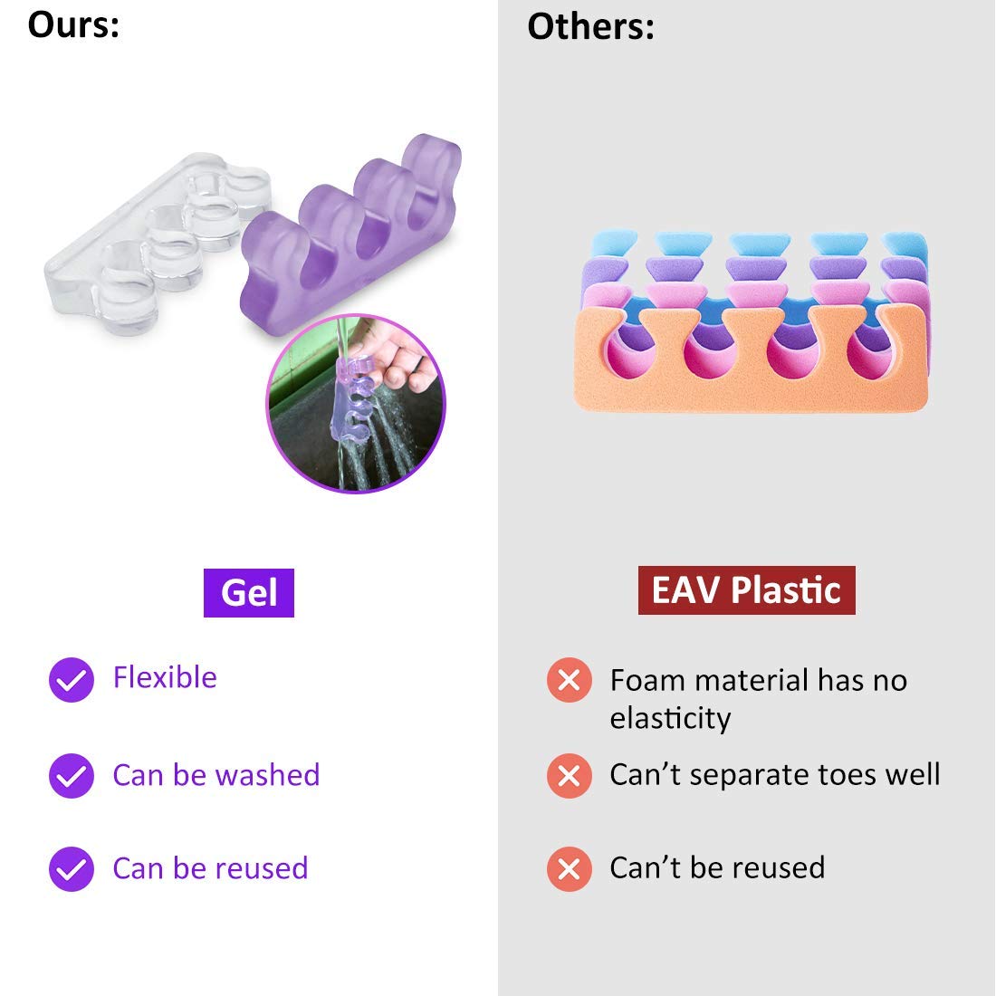 - 🙍【Reusable For Easy Cleaning】: Toe separators can be repeatedly cleaned, and the jelly material that can be used multiple times is not easily deformed. An upgraded version of the foam toe separators pedicure.Wash with water once before use.