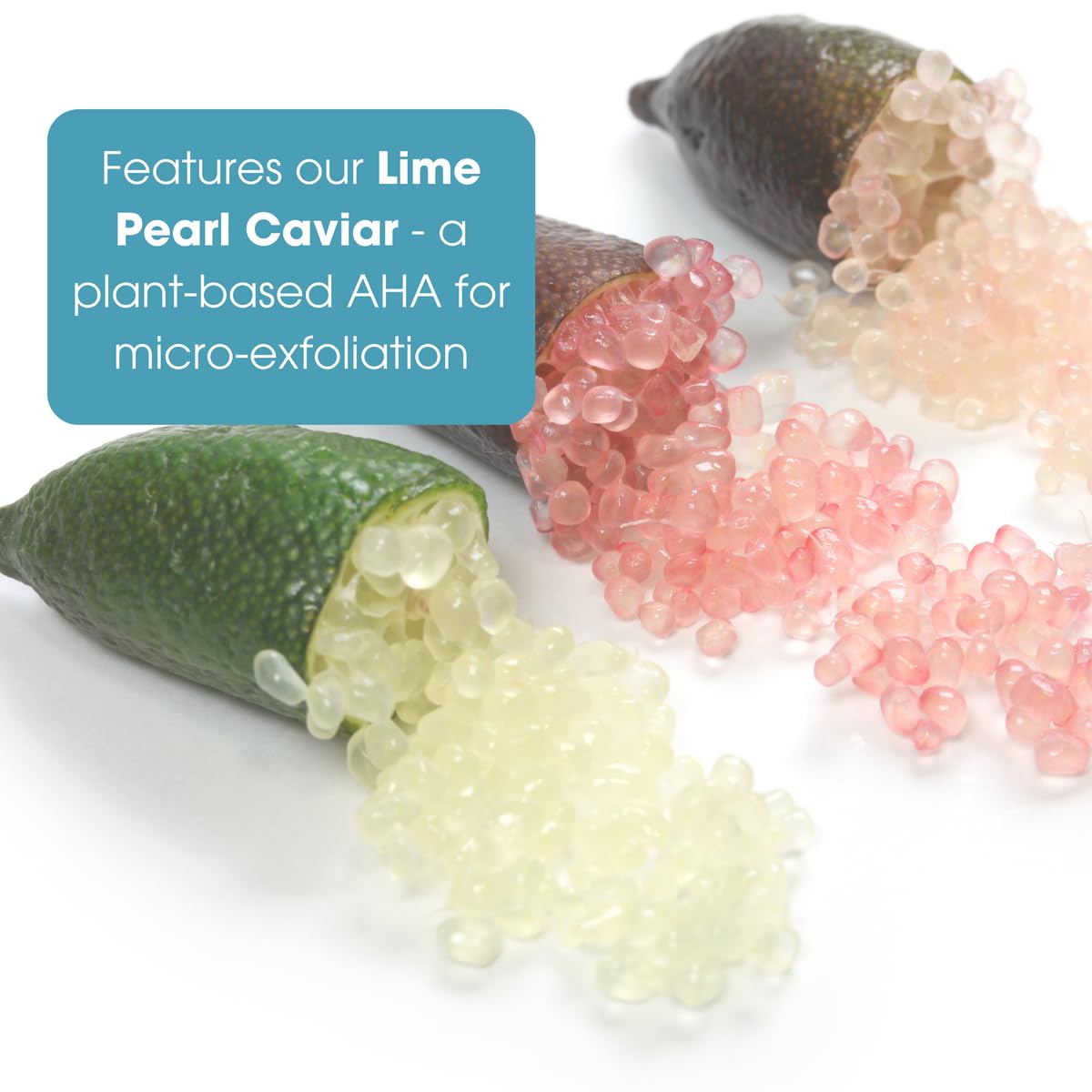 - Features our Lime Pearl Caviar - a plant-based AHA for micro-exfoliation