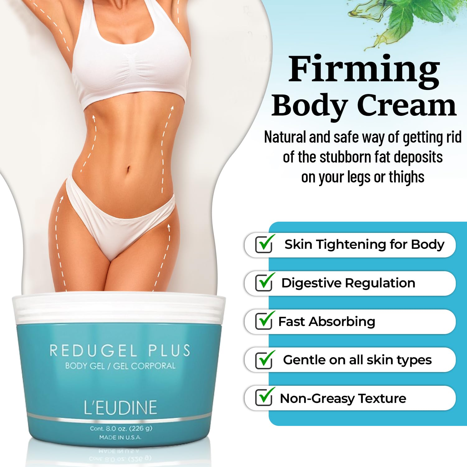L’EUDINE Redugel Plus Skin Tightening Cream for Body, Firming Cream with Mint Oil, Field Horsetail, Marine Algae, Maca Extract, Skin Firming and Tightening Lotion – 8oz