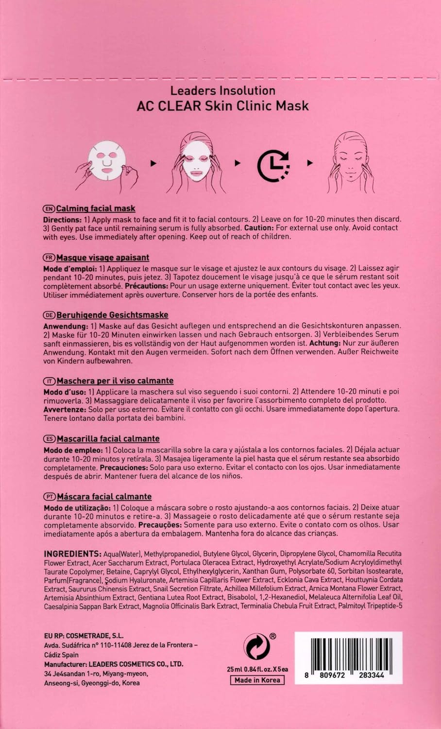 Leaders Insolution AC Clear Skin Clinic Mask | Snail Secretion & Tea Tree Oil for Acne, Redness, Oil Control | 100% Cotton Bemliese Sheet | Balances & Soothes Sensitive Skin (5 Sheets)