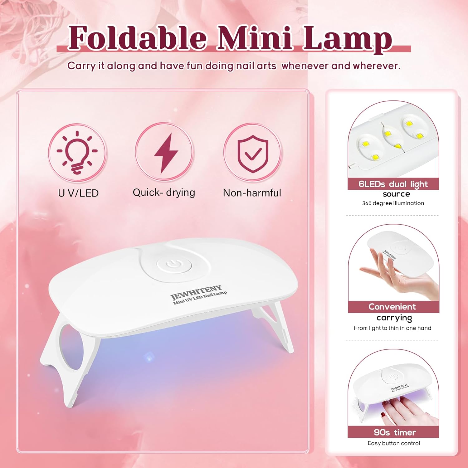 - Mini Nail Lamp:The mini gel nail polish curing light is compact in pocket size with a USB cable. Compatible With All Kinds Of Gel Nail Polish,including all brand’s base coat, top coat, hard builder gel, poly nail gel, rhinestone glue etc. Big enough space for your fingernails and toenails.