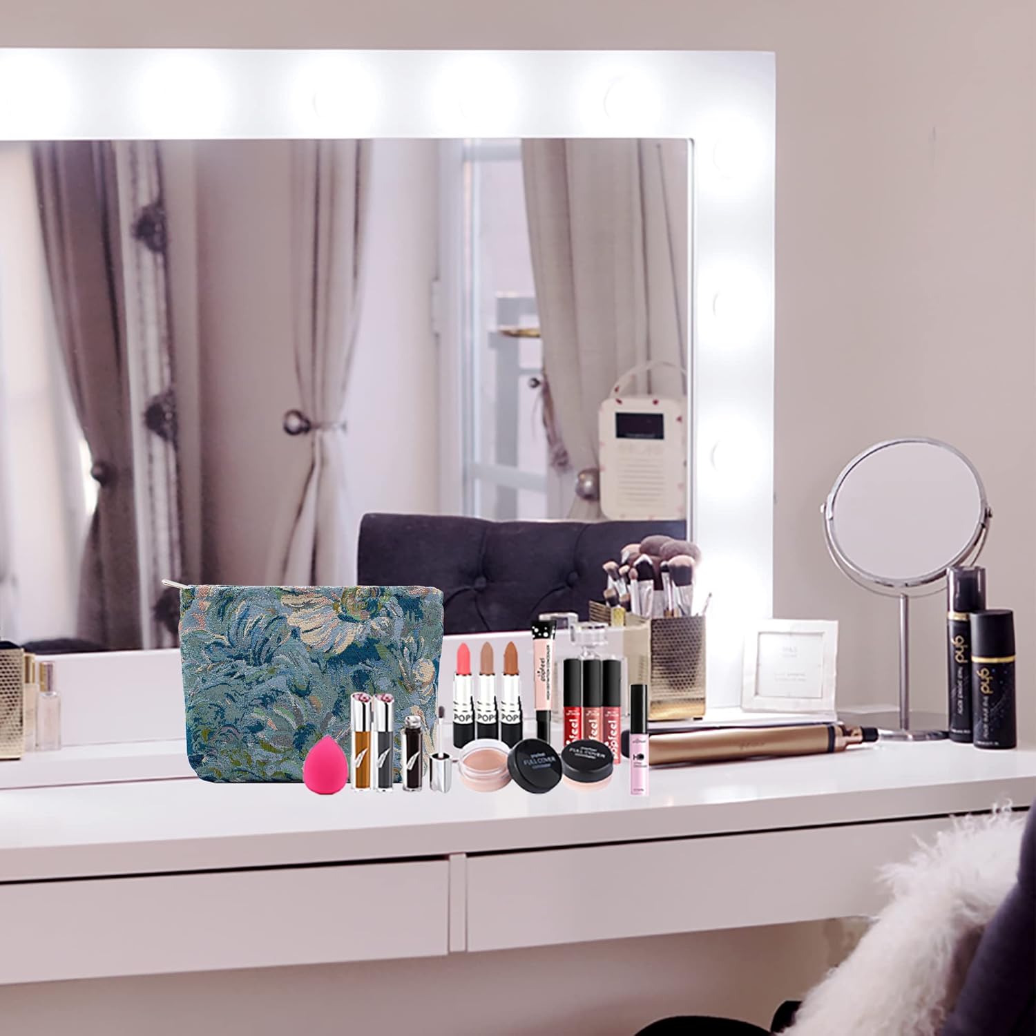 Makeup Bags for Purse Zipper Cosmetic Pouch Large Travel Canvas Make Up Organizer Tool Pouch for Women and Girls,Flower Blue