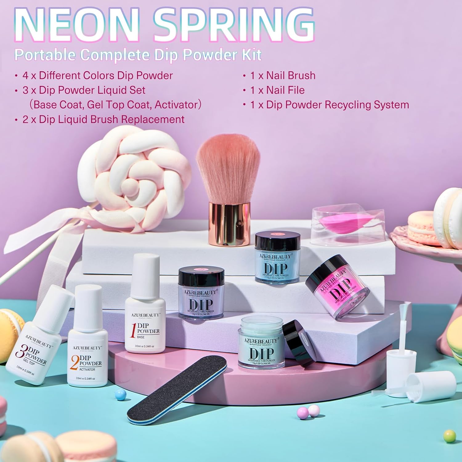 - 【Essential Choice for Beginners】 AZUREBEAUTY 12 Pcs Complete Nail Dip Powder kit was developed especially for beginners, for a small fee you can get a complete dipping powder kit, Including 4*10g Spring Summer dip powder Set with hot pink、cyan、blue violet、indigo blue, 3*10ml liquid set (base coat/activator/top coat), 2*liquid brush replacement, 1*nail brush,1*nail file, 1*dip powder recycling system, User Manual Quick Start Guide.