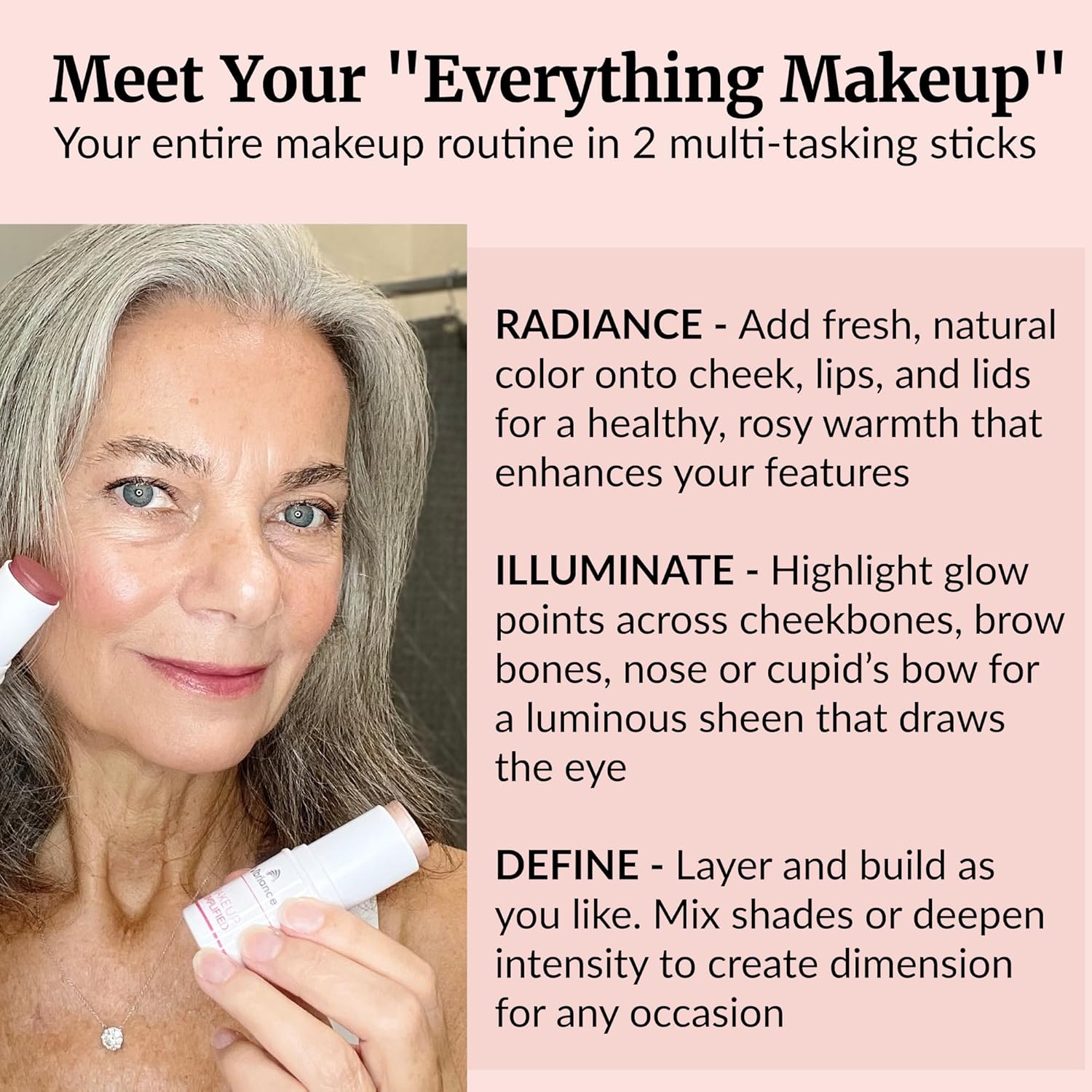 - Scientifically backed beauty - We merge science and beauty. Our makeup sticks are not just cosmetics for older women; they’re skincare products that reflect our dedication to premium, scientifically backed products for older women.
