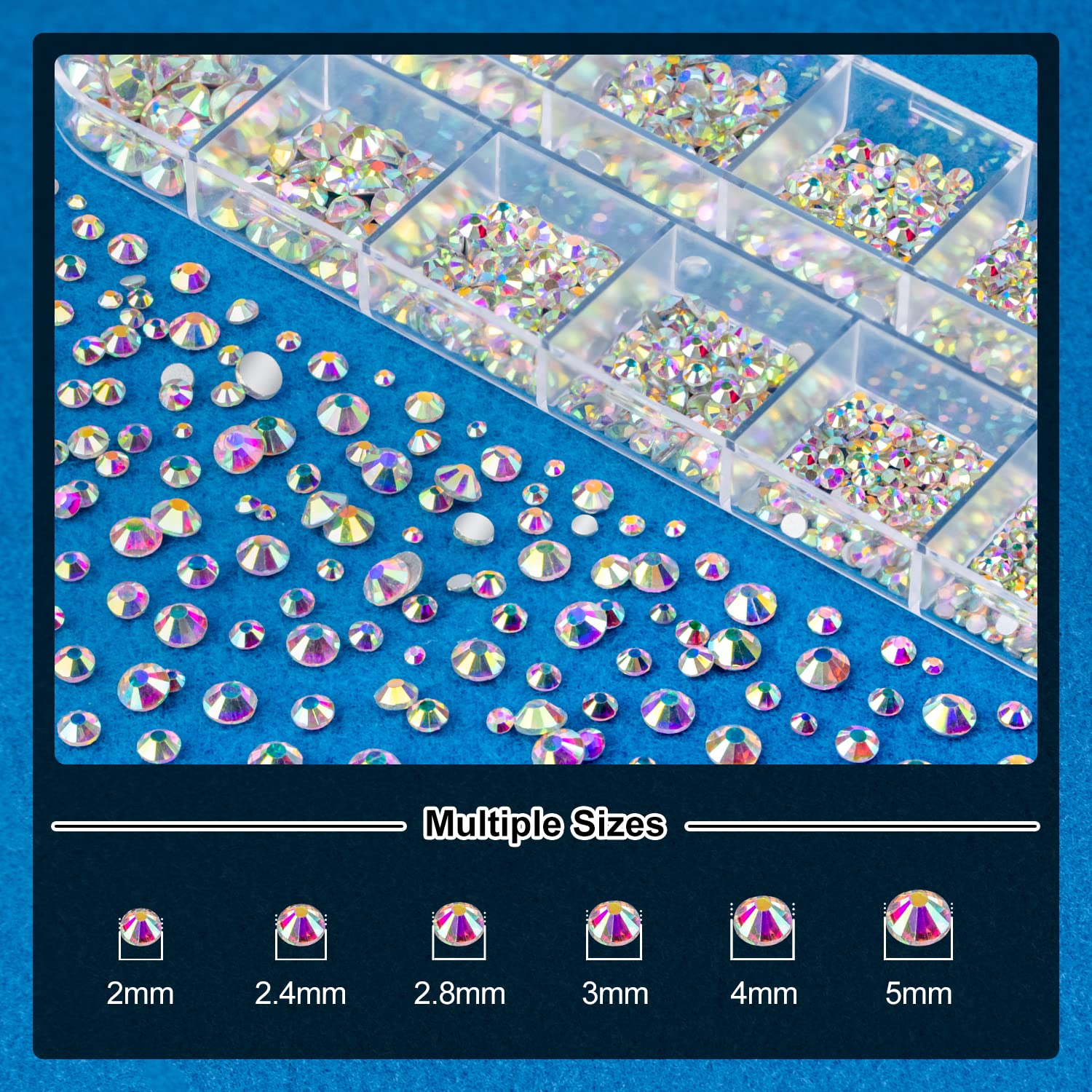 - 💎MULTIPLE SIZES: This set provides 1 box of Flat-back round glass crystal AB rhinestones with 6 sizes: 2mm、2.4mm、2.8mm、3mm、4mm、5mm; 1 box of Flat-back round glass clear gems with 6 sizes: 2mm、2.4mm、2.8mm、3mm、4mm、5mm. Great size range for your nail art decoration!