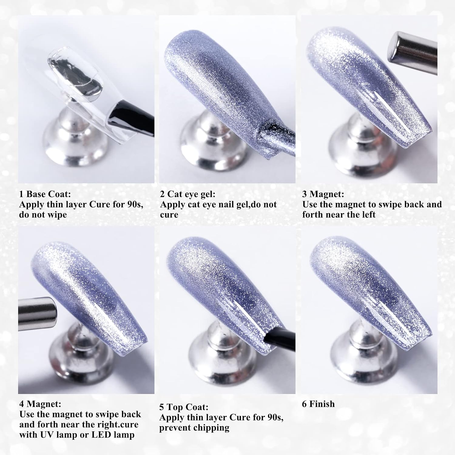 - Applying our Gel Nail Polish is a breeze, simply follow our step-by-step instructions for flawless results every time: Use the magnet to create desired pattern before curing. Apply gel top coat for gorgeous shimmery and sparkly finish. Heat up in winter to reduce thickness