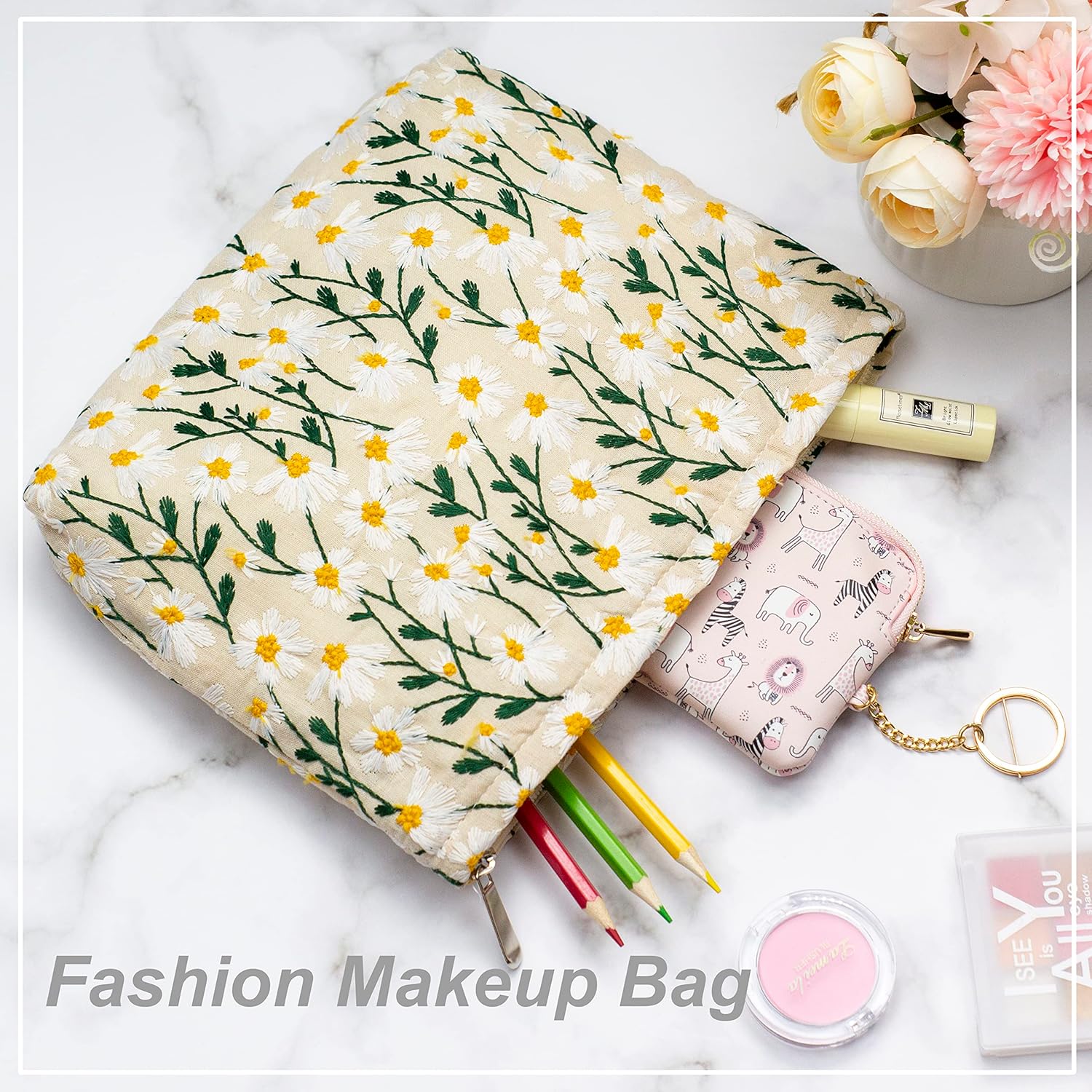 Makeup Bags for Purse Zipper Cosmetic Pouch Large Travel Canvas Make Up Organizer Tool Pouch for Women and Girls,Daisy White