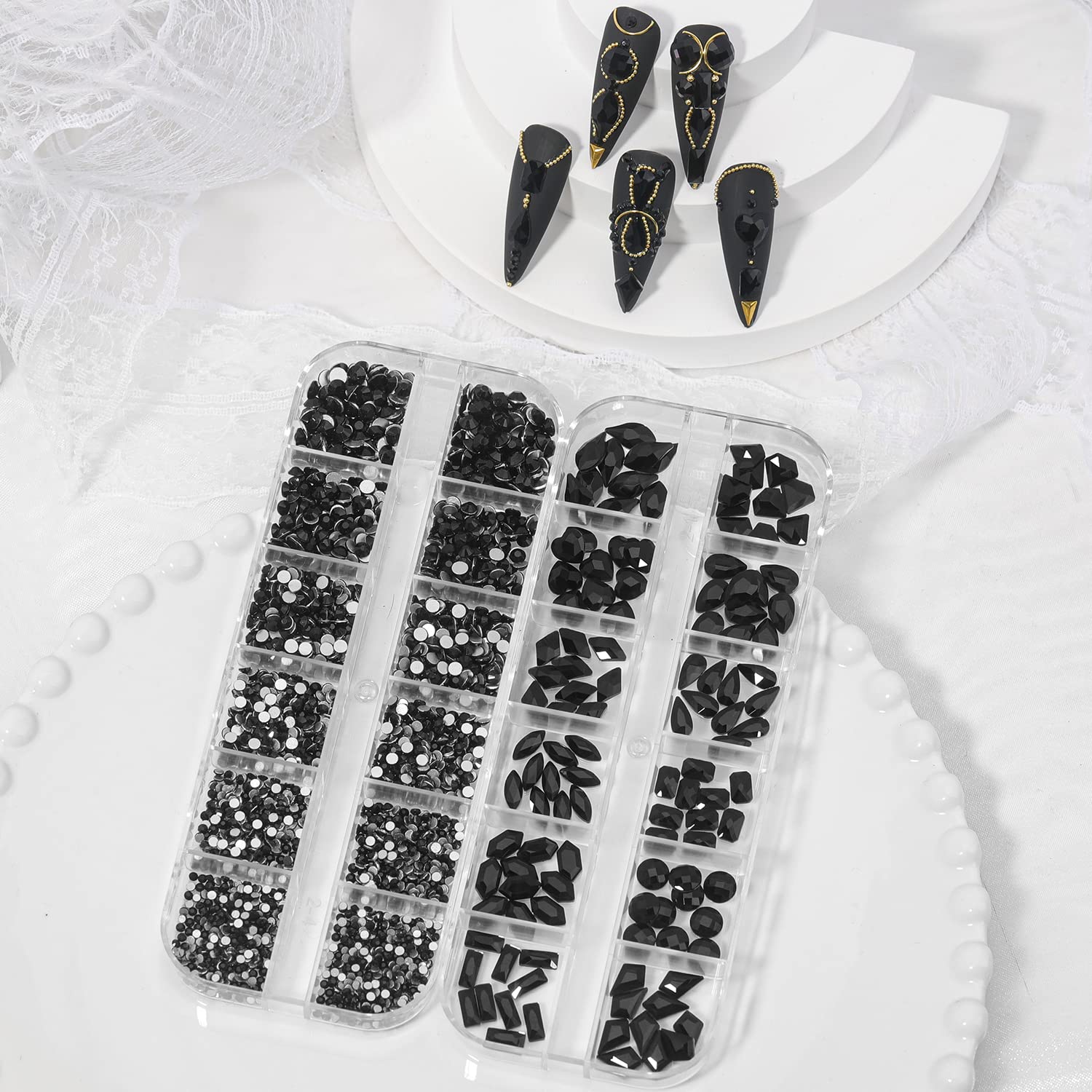 - ★Crystal black nail rhinestones - contains 2 boxes nail rhinestones and gems,black flat back nail rhinestones and 120pcs multi-shape black nail rhinestones, 1pcs tweezer, 1pcs rhinestone picking pen and 6 sizes round black nail gems for nails