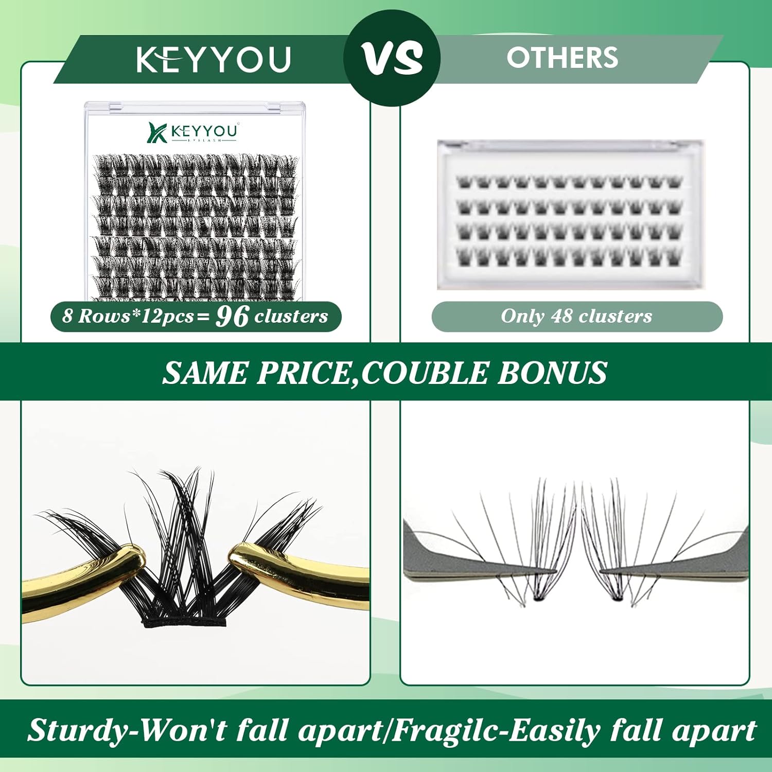 - 【Soft&Comfortable】KEYYOU lash cluster are made of imported materials,the stem line is thinner and softer, the eyelash cluster are lighter and more comfortable to wear.96 clusters in one tray ,more cost-effective.