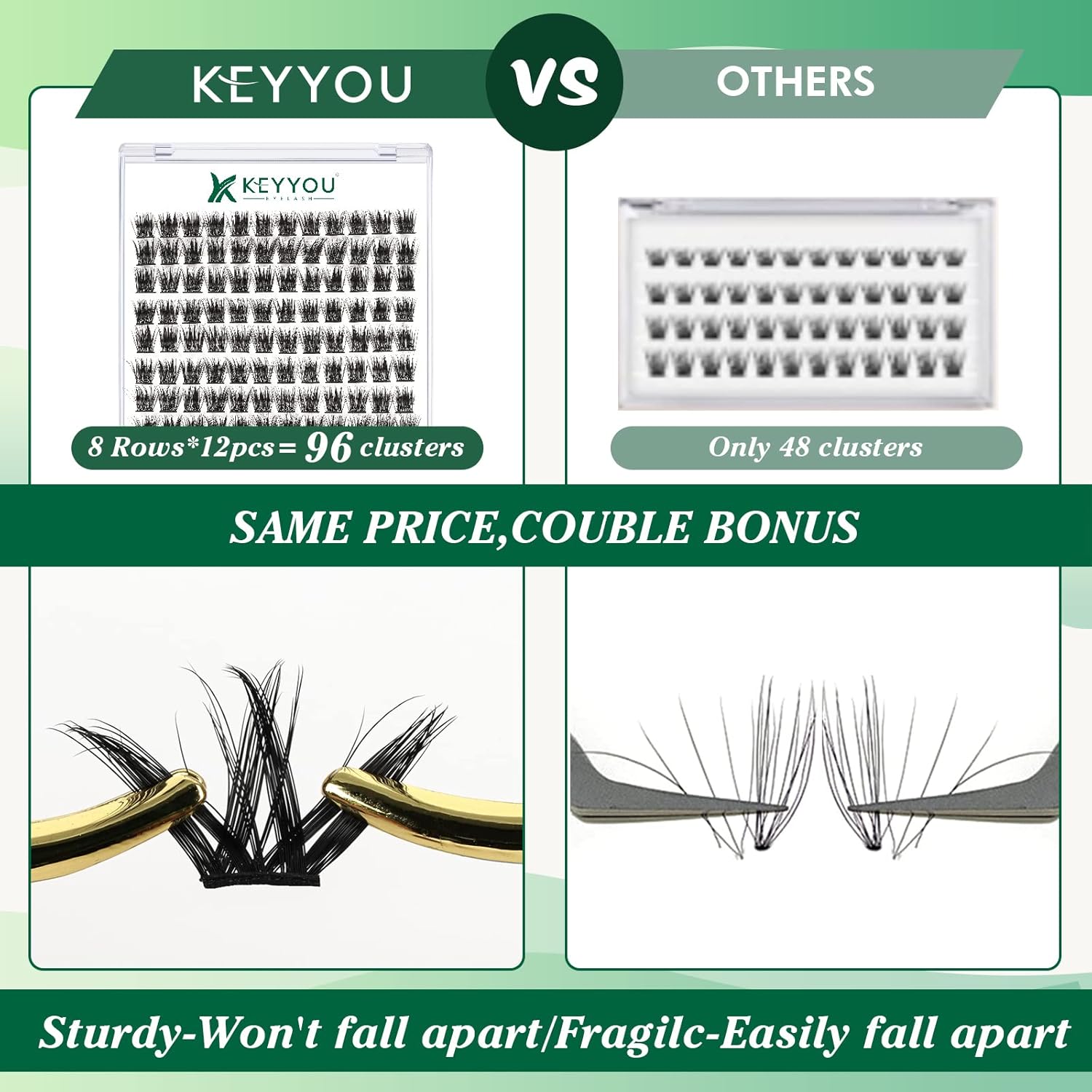 - 【Soft&Comfortable】KEYYOU lash cluster are made of imported materials,the stem line is thinner and softer, the eyelash cluster are lighter and more comfortable to wear.96 clusters in one tray ,more cost-effective.