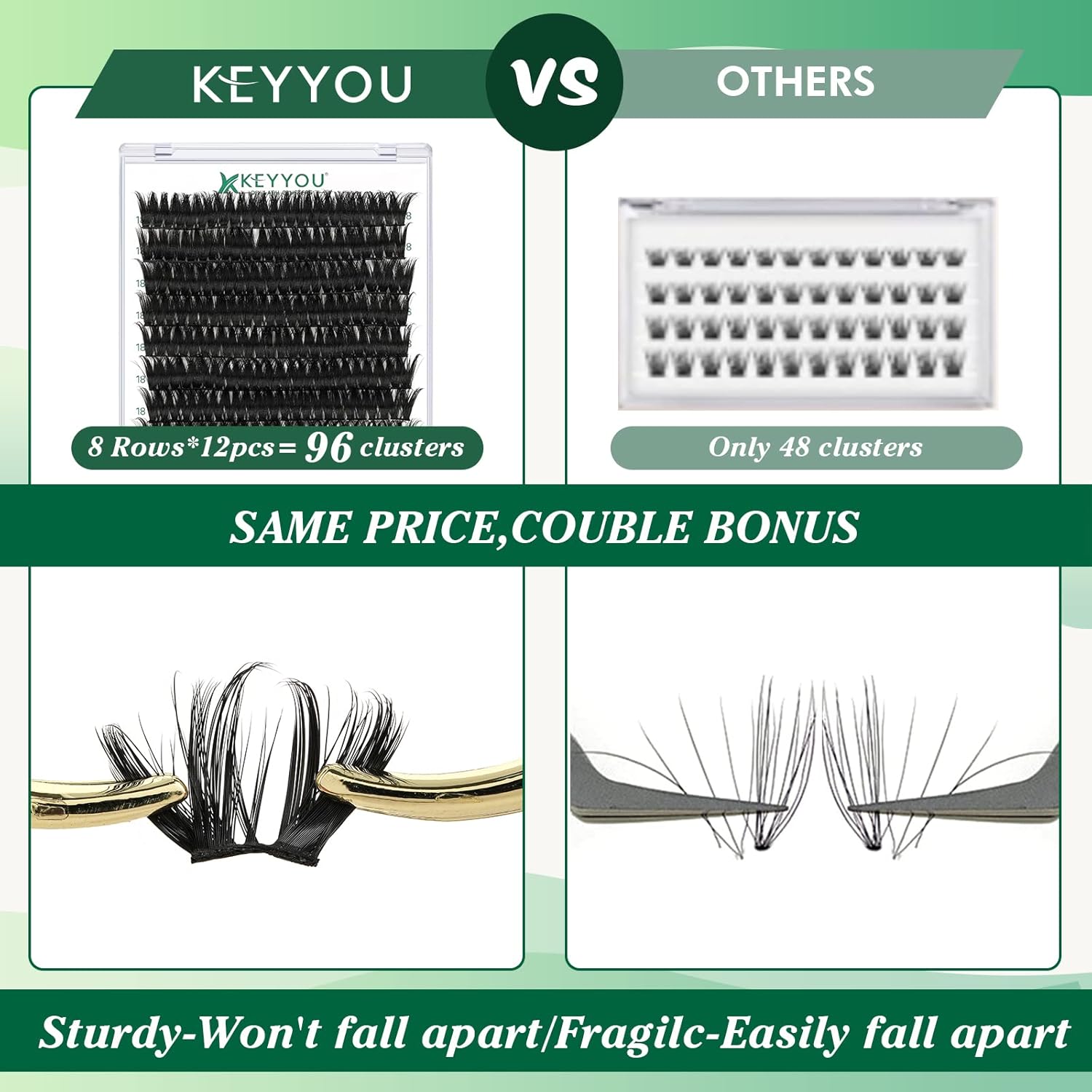 - 【Soft&Comfortable】KEYYOU lash cluster are made of imported materials,the stem line is thinner and softer, the eyelash cluster are lighter and more comfortable to wear.96 clusters in one tray ,more cost-effective.