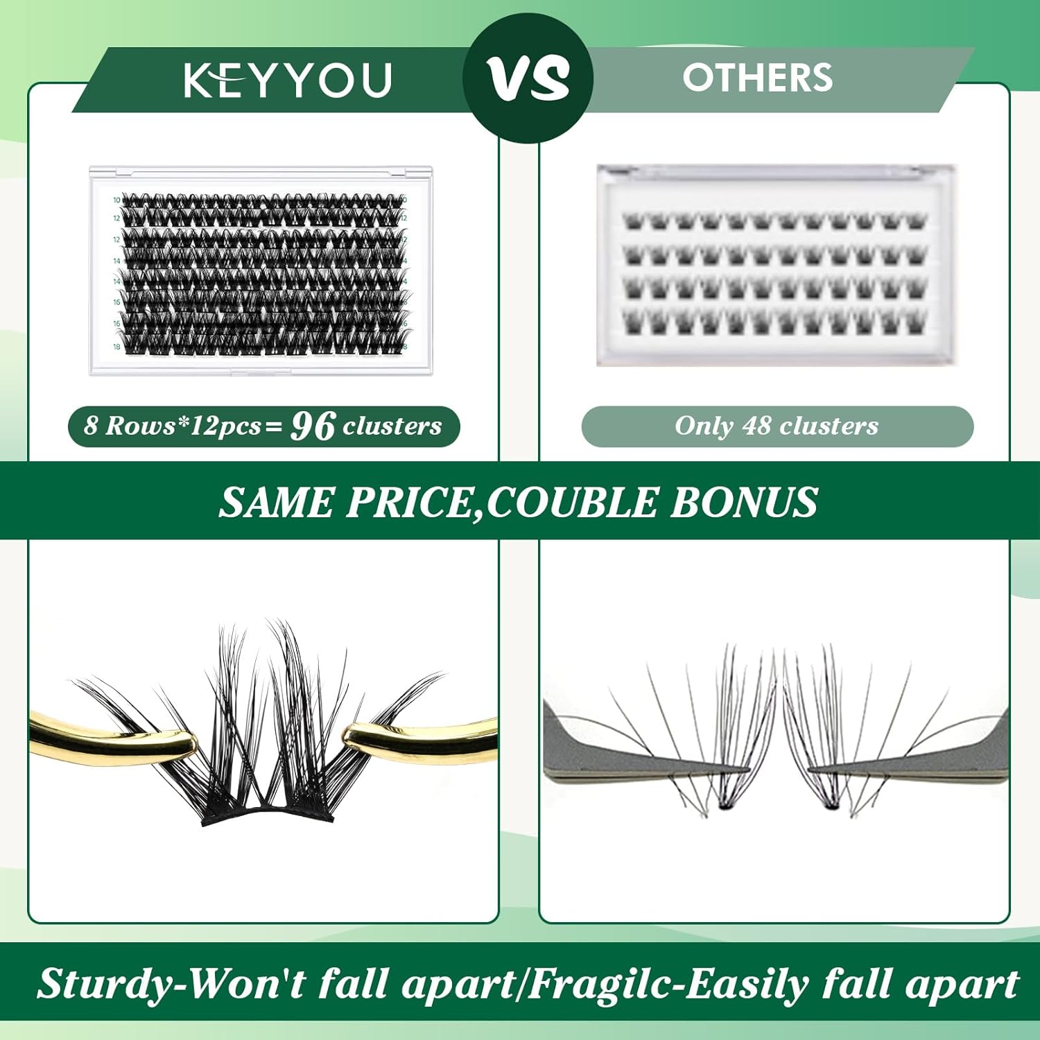 - 【Soft&Comfortable】KEYYOU lash cluster are made of imported materials,the stem line is thinner and softer, the eyelash cluster are lighter and more comfortable to wear.96 clusters in one tray ,more cost-effective.
