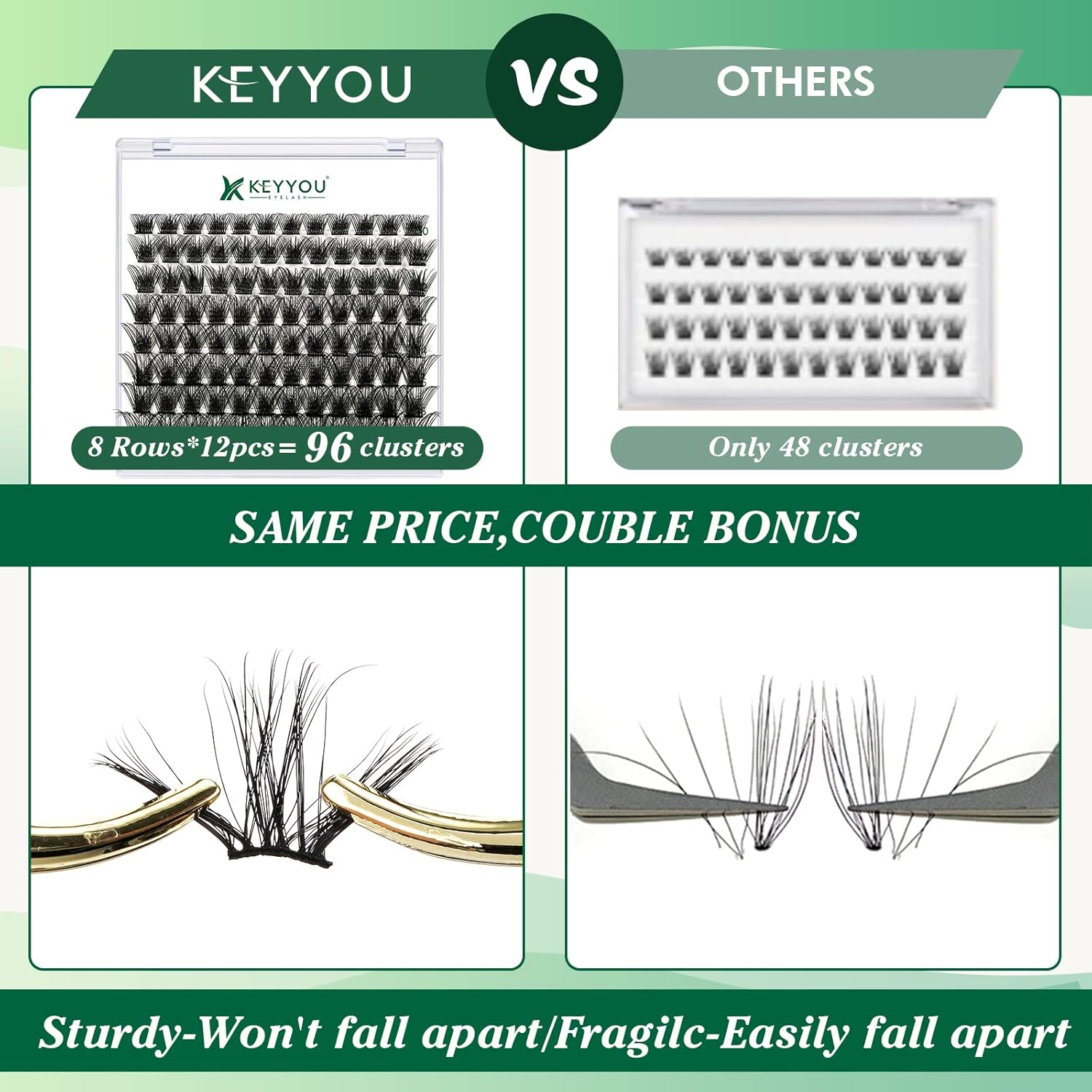 - 【Soft&Comfortable】KEYYOU lash cluster are made of imported materials,the stem line is thinner and softer, the eyelash cluster are lighter and more comfortable to wear.96 clusters in one tray ,more cost-effective.