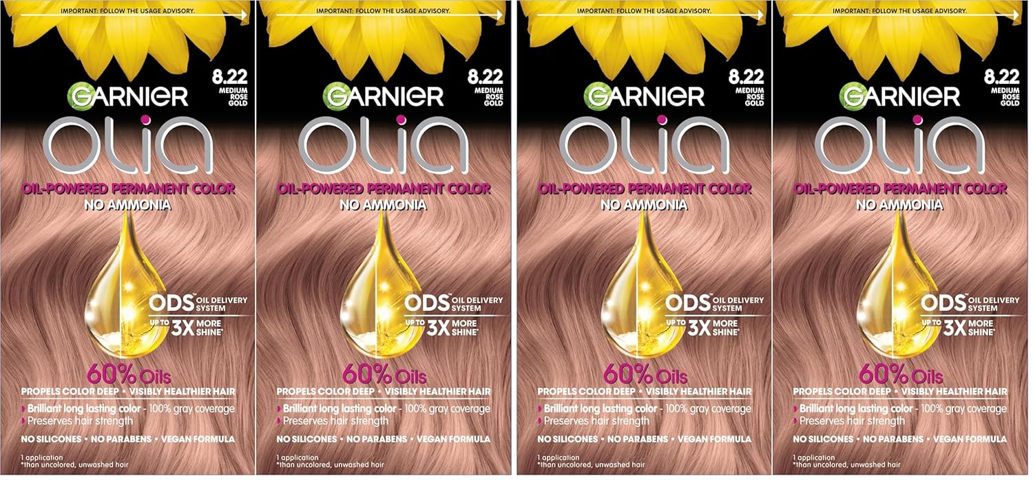 - Oil powered with no ammonia permanent hair color Olia shade 8.22 Medium Rose Gold is a medium shade with delicate golden rose reflects that provides 100% gray coverage to achieve vivid, radiant long lasting color for all hair textures