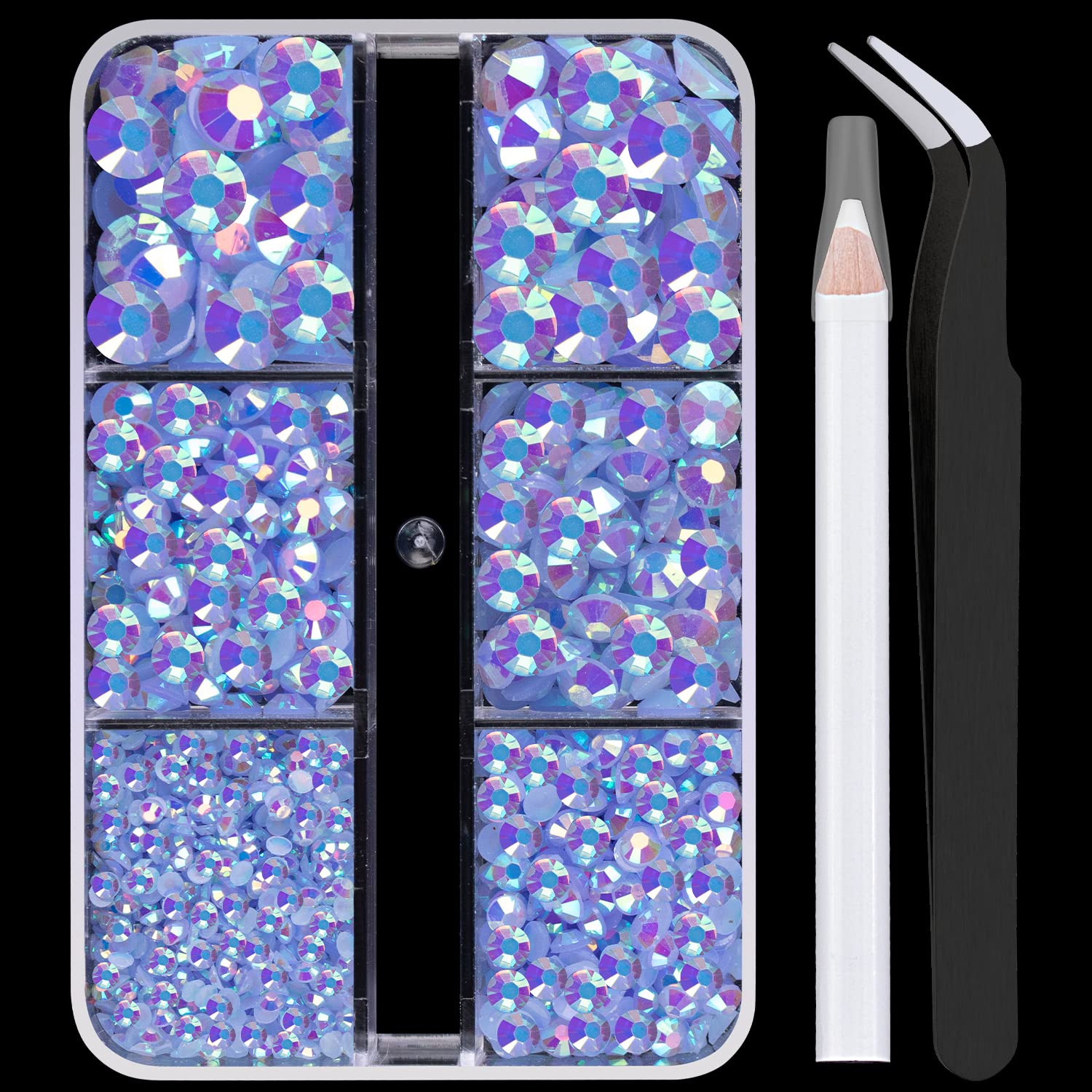 - 💎PACKAGE CONTENT -- This resin rhinestone kit includes 1 box with 6 grids, featuring various sizes: 2mm x 1 grid, 3mm x 1 grid, 4mm x 1 grid, 5mm x 1 grid, and 6mm x 2 grids. Additionally, a tweezer and 1 pickup pencil are included for easy picking up of rhinestones. This set offers more large-size gems, with 2 grids filled with 6mm rhinestones. Great for DIY craft decorations, eye makeup, face makeup, nail art.