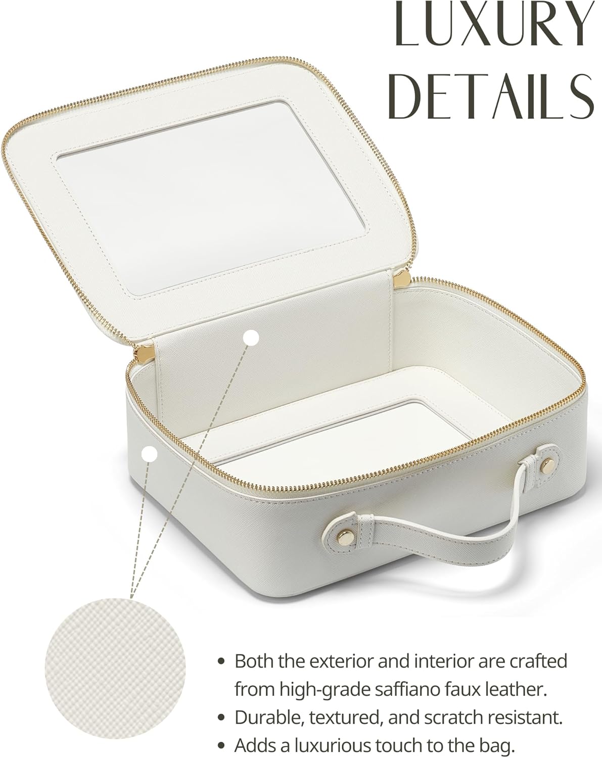 - [Premium Material and Durability] – The clear cosmetic case, both the exterior and interior, is crafted from high-grade saffiano faux leather, which is highly scratch resistant, durable and exceptionally easy to keep clean. It features a smooth zipper for secure closure, and elegant light gold metal hardware accents, adding a luxurious and sophisticated touch to the bag's overall design.