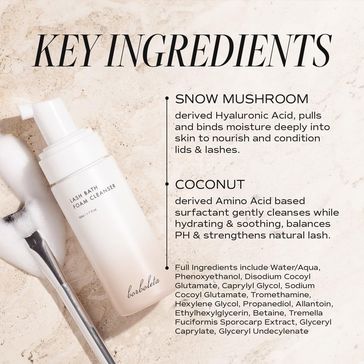 - NATURAL INGREDIENTS FOR GENTLE CARE - Borboleta Lash Bath Foam Cleanser is formulated with natural ingredients such as hyaluronic acid and amino acids derived from Snow Mushrooms and coconut to hydrate, condition, and nourish your lashes.