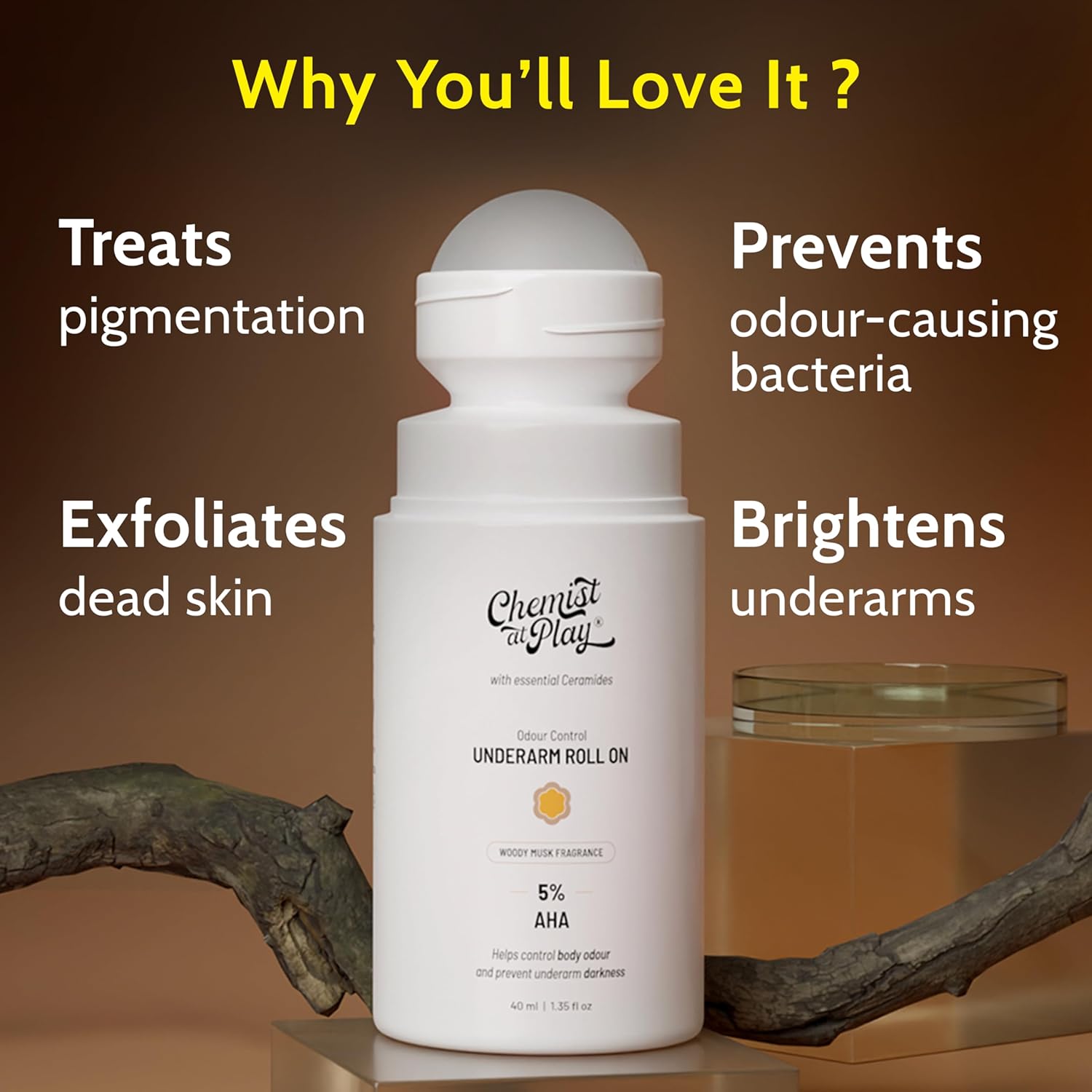UnderArm Roll-On with 5% AHA|Lactic & Mandelic Acid|Prevents Odour, Brightens Skin & Exfoliates Underarm|For Sensitive Skin |Woody Musk Fragrance |Alcohol & Aluminium Free | 1.35 fl oz