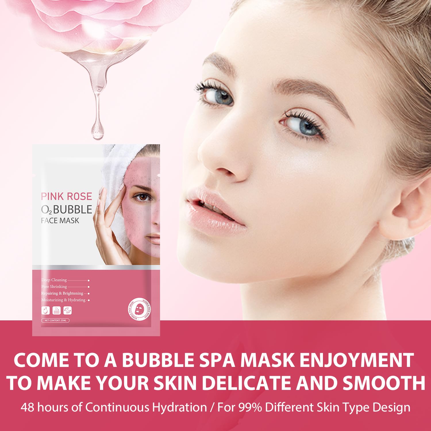 - PINK ROSE O2 BUBBLE FACE MASK: Rose is a very gentle, safe, effective skincare and good smell ingredient that has antioxidant properties and helps to brighten the skin, firm skin, and moisturizing skin, for a firmer, younger look. The rose-foaming oxygenating face mask was gentle yet effective. The antioxidant properties of roses help brighten and firm your skin, leaving it moisturized and youthful. can feel the nourishing effect it has on your complexion after continuing to use it.