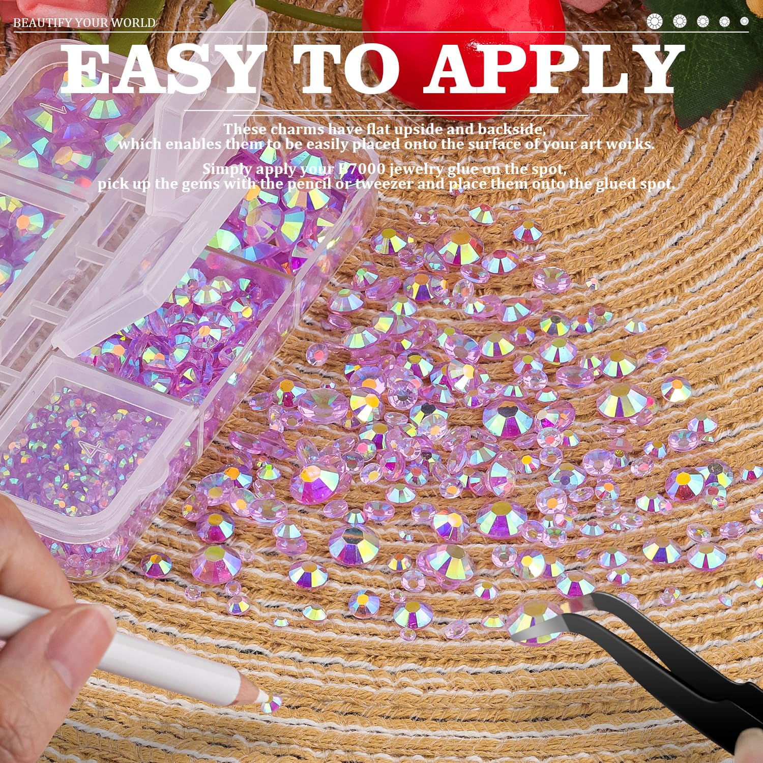 - 💎WIDE APPLICATION -- These sparkling iridescent resin rhinestones are perfect for creating dazzling looks. Use them for face makeup, eye makeup, body art, 3D nail art or bedazzling DIY crafts like shoes, tumblers, mugs, bottles, phone cases, popsockets, scrapbooks, photo frames, diamond paintings, greeting cards, bags, glasses, guitars, keychains, hats, masks, hair clips, bracelets, wristbands, clothing, wedding dresses, and more. Apply it to what you want to bling!