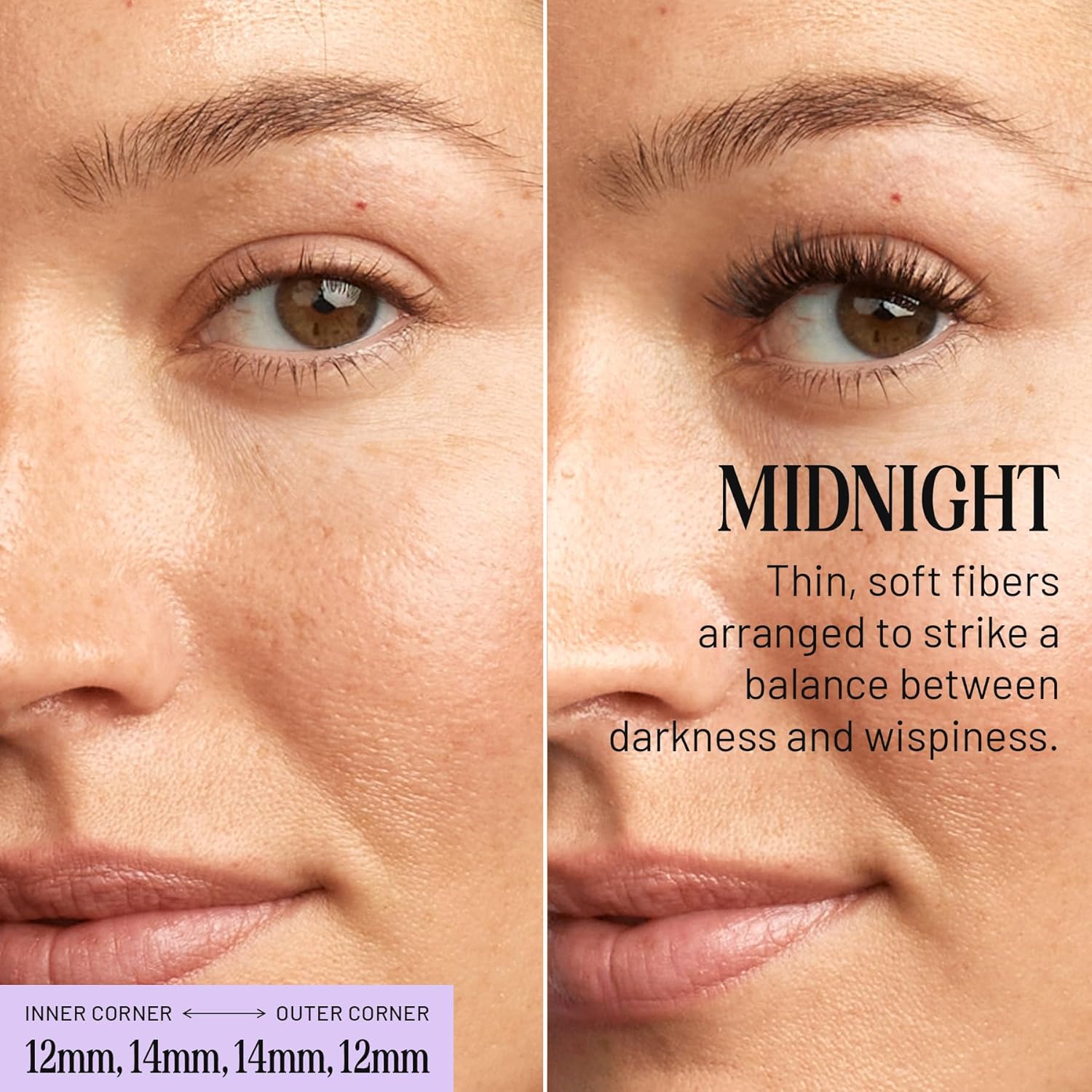 - Midnight Lashes - A dark, lush lash. Picture the same ultralight fibers from Originals, tightly clustered with a criss crossing flair for the perfect balance between drama and whimsy. Available in 10, 12, 14, and 16mm to find your ideal natural fit.