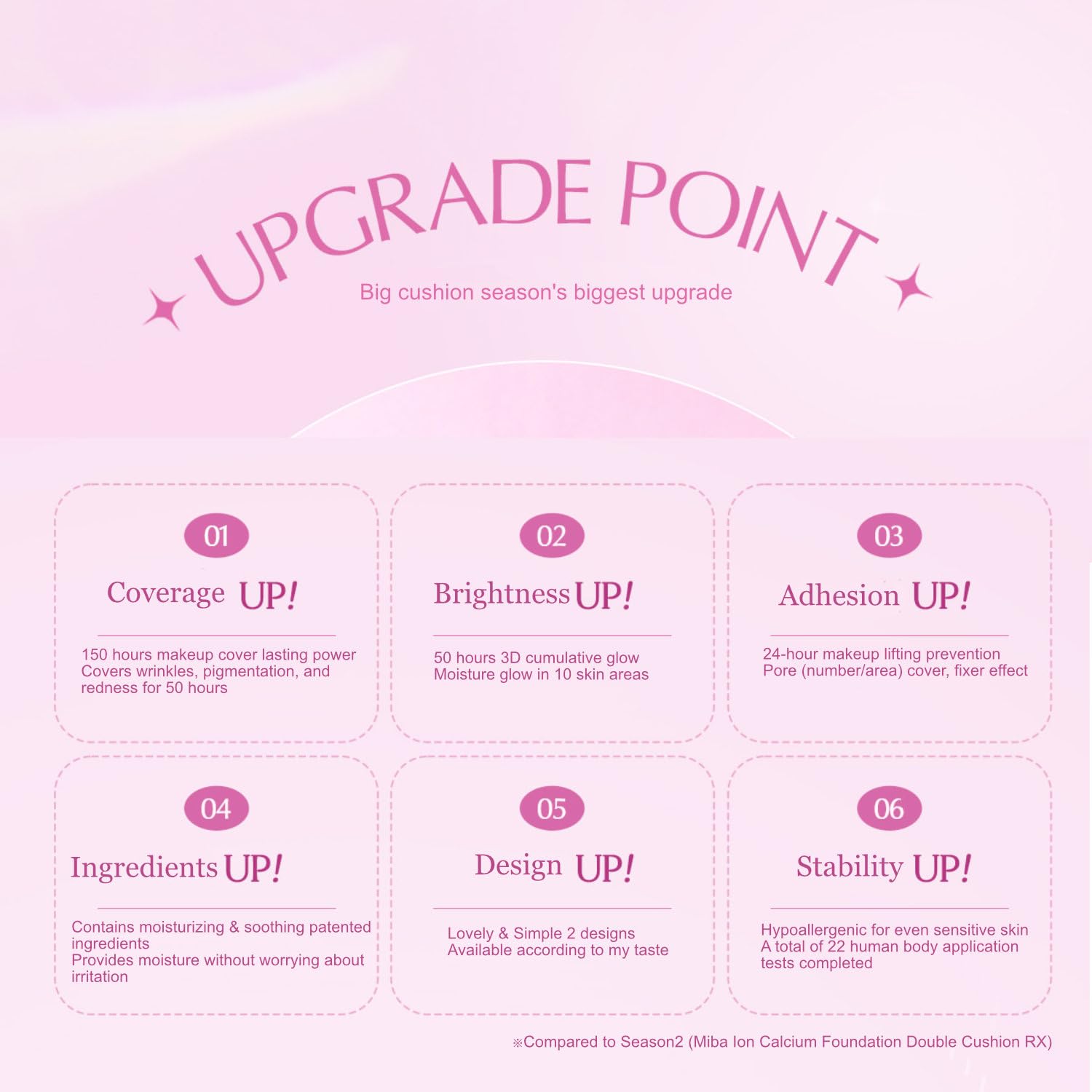 - [Coverage UP!] Long lasting makeup cover Covers pigmentation and redness for a long time [Glowing power UP!] Moisture and glow in 10 areas of the skin [Adhesion UP!] Prevents makeup from flaking off for 24 hours Covers pores (number/area), fixer effect [Ingredients UP!] Contains moisturizing & soothing patented ingredients Provides moisture without worrying about irritation [Design UP!] Two designs: Lovely & Simple [Stability UP!] Hypoallergenic considering even sensitive skin