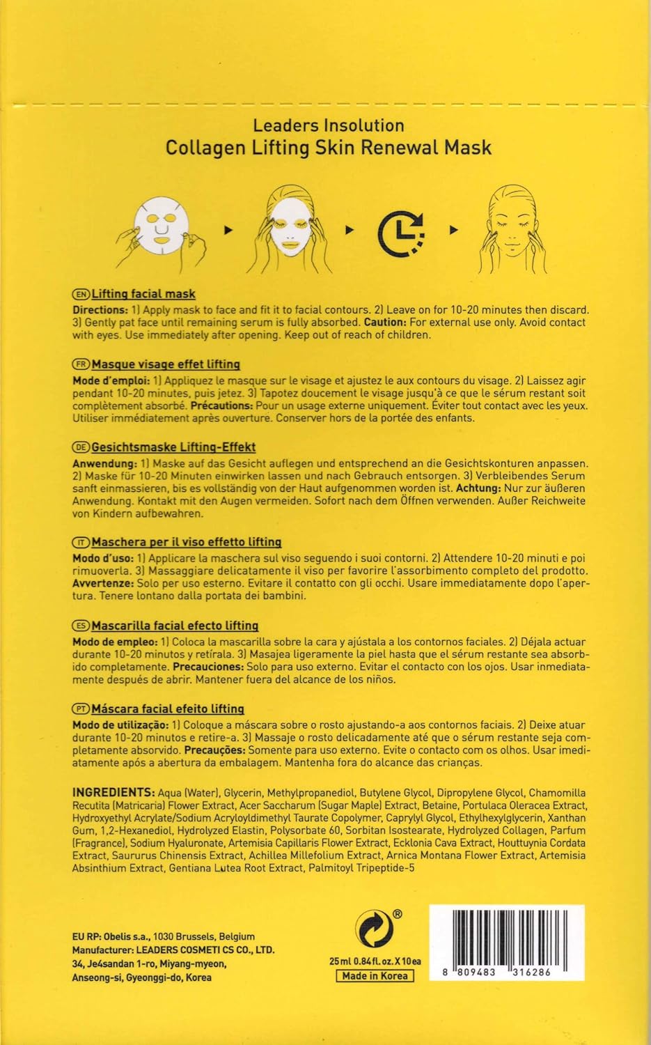 - LEADERS QUALITY ASSURANCE β Manufactured in South Korea by Leaders, a renowned skincare brand with its own R&D center and production facilities, each product undergoes rigorous testing to ensure the highest quality and effectiveness. Leaders Insolution Collagen Lifting Masks are easy to use: Cleanse and prep skin with toner. Remove mask from the pouch and fit to facial contours. Leave on for 10-20 minutes for optimal results. Gently massage extra serum into face and neck until fully absorbed.