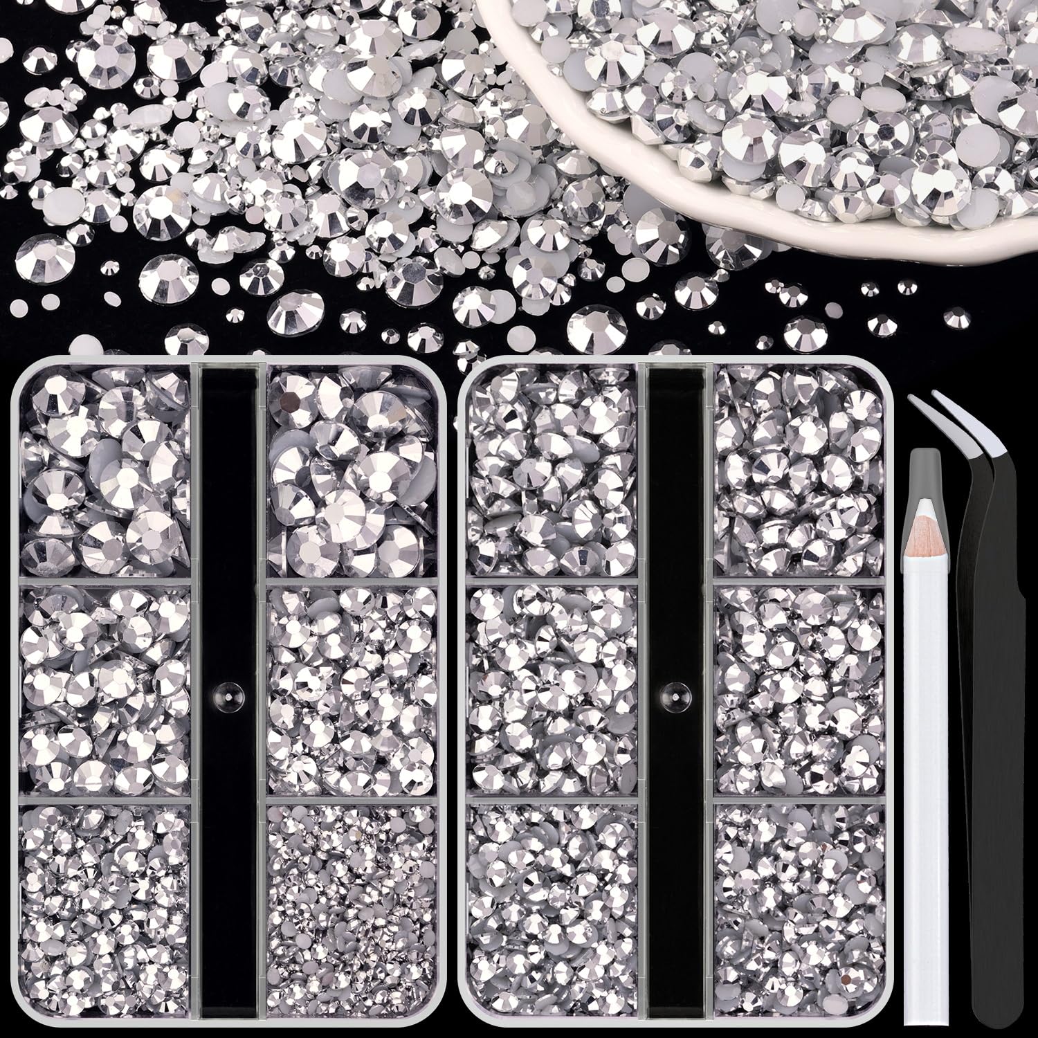 - 💎PACKAGE CONTENT -- This resin rhinestone package includes 2 boxes with 6 grids, featuring a variety of sizes: Box #1 contains 2mm x 1 grid, 3mm x 1 grid, 4mm x 1 grids, 5mm x 1 grids, and 6mm x 2 grids; Box #2 contains 3mm x 2 grids, 4mm x 2 grids, 5mm x 2 grids. 1 tweezers and 1 pickup pen are included for easily picking up of rhinestones. This set offers more large-sized gems, making it perfect for DIY craft decorations, eye makeup, face makeup and nail art.
