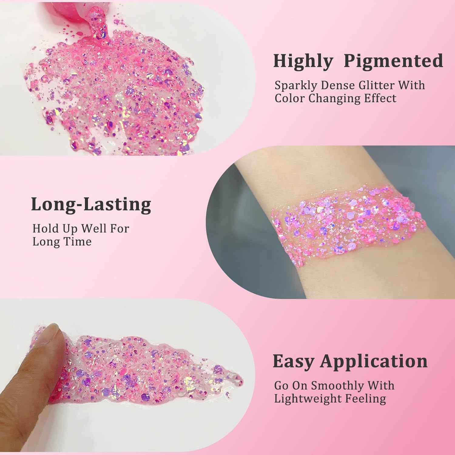 MEICOLY Chameleon Light Pink Body Glitter,Chunky Face Glitter for Halloween,Color Changing Mermaid Face Glitter Gel,Holographic Glitter Sequin for Face Body Hair,Festival Party Cheer Glitter Makeup