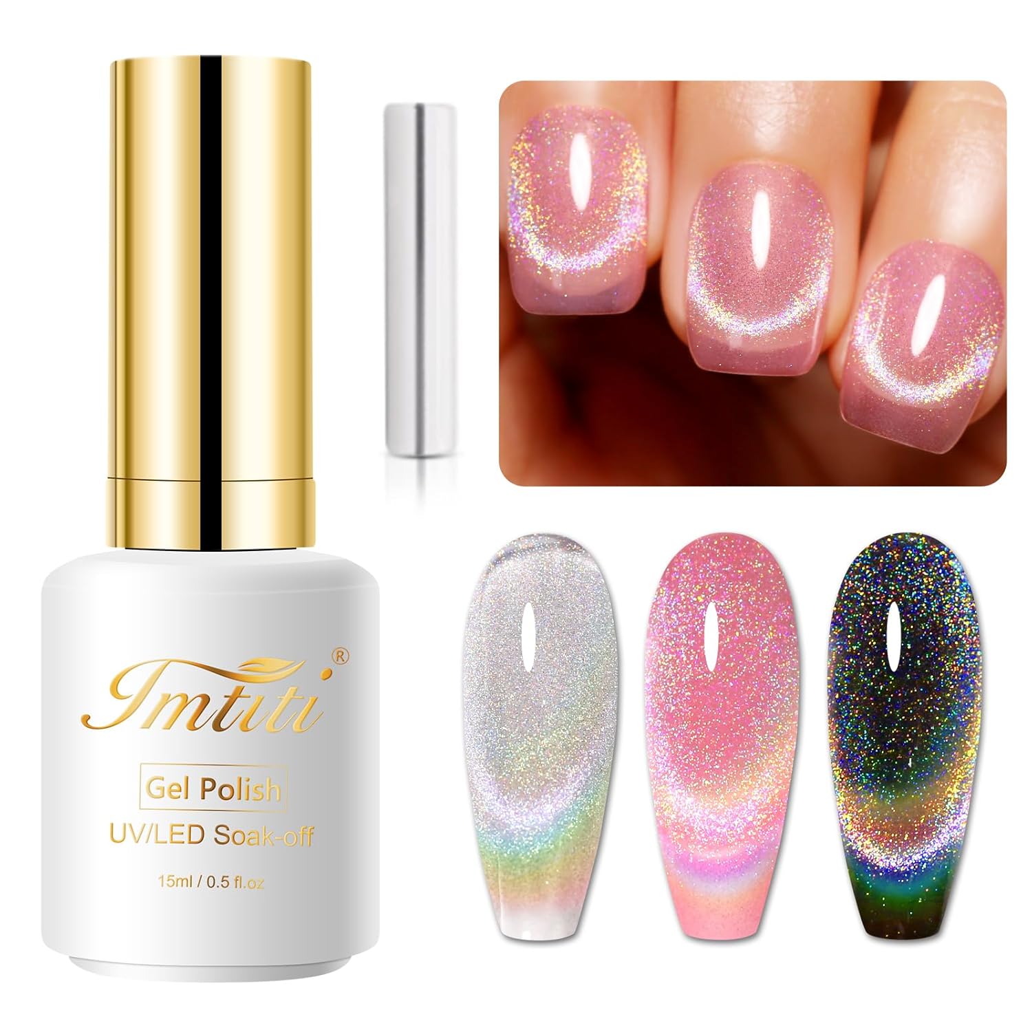 Imtiti Cat Eye Gel Nail Polish, 15ml Glitter Rainbow Holographic Gel Nail Polish with Magnet Iridescent Reflective Shimmer Translucent UV Gel Polish 0.51 Fl Oz
