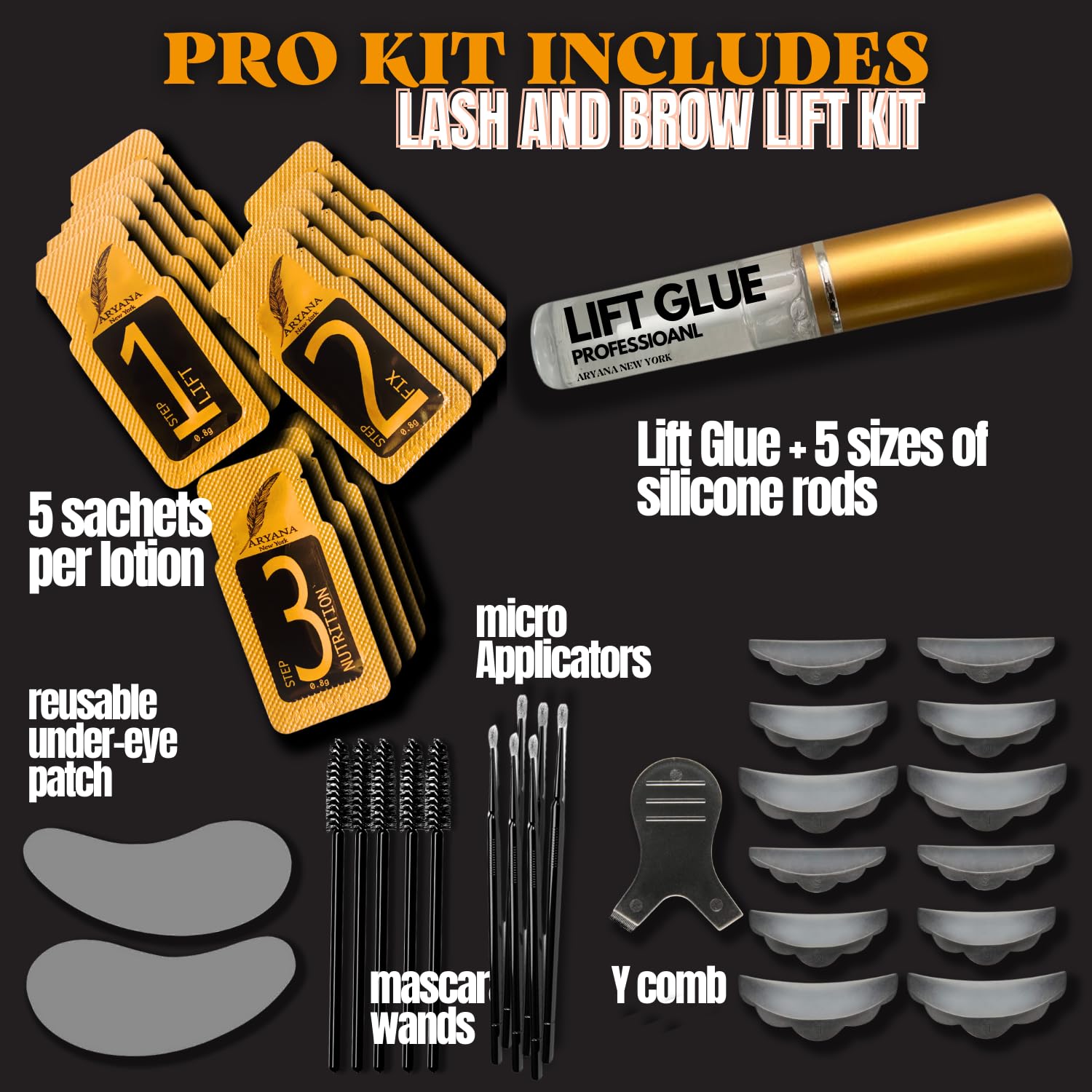 - ARYANA New York Lash Lift and Eyebrow Lamination Kit 2-in-1: One Solution for MEGA Lashes and Feathered Lifted Eyebrow.Transform your lashes and eyebrows into stunning works of art with our all-in-one kit! Achieve professional salon results from the comfort of your home.