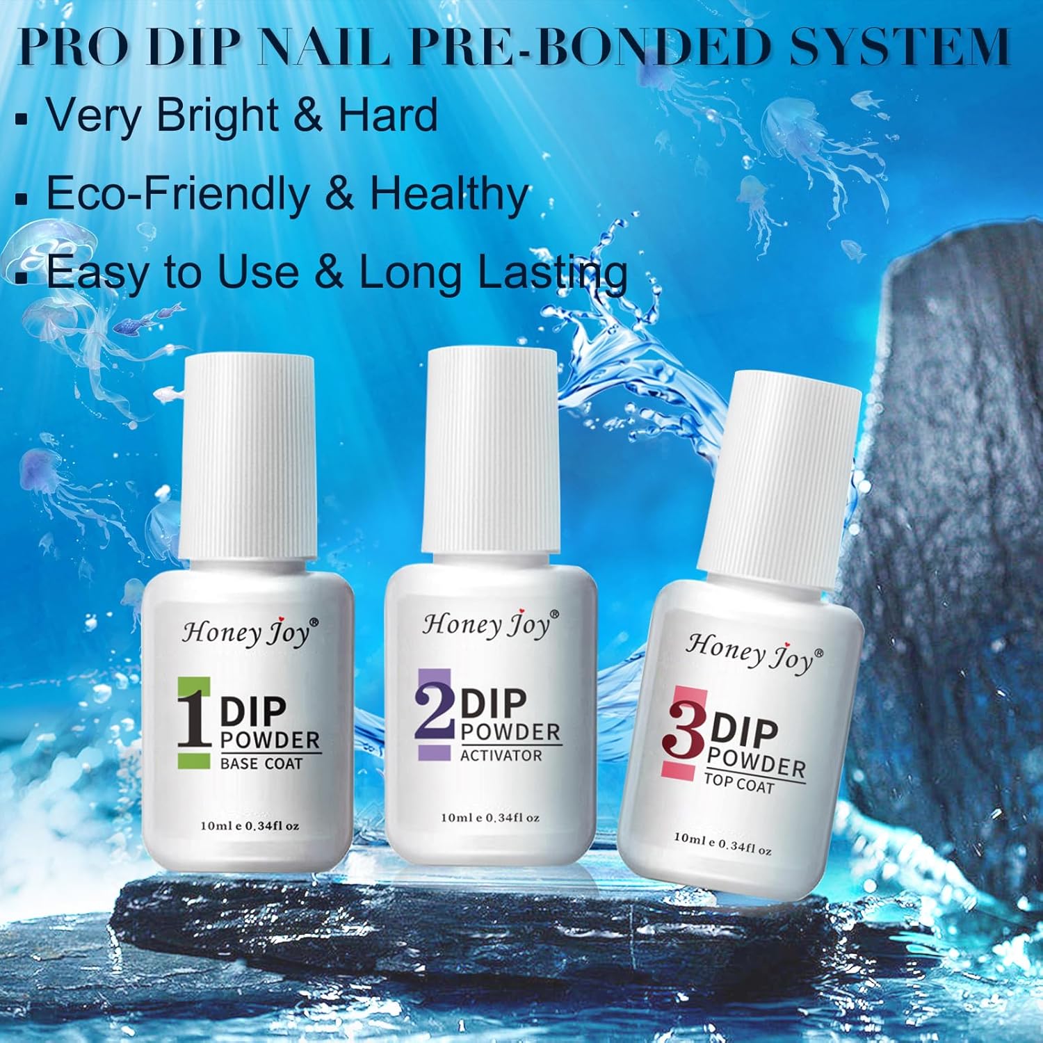 - 🎁Dip Powder Nail Kit Includes: Experience the enchanting hues of our Honey Joy Blue Dip Powder Liquid Set, a perfect dip powder nail kit starter. This kit contains 4 x radiant dipping powder shades (10g each) for that soft blush to playful bubblegum pop, along with a dip nails liquid set including base & top coat, and activator (10ml each). Additionally, you'll find 4 professional tools (including a nail brush, cleaner stick, and nail file) to achieve that coveted high-quality, salon-effect at home with our comprehensive dipped nails powder starter kit.