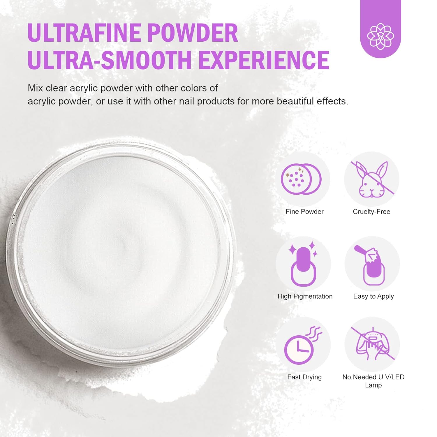 - Versatile Clear Acrylic Powderββ: Bubble-free ultra-clear acrylic nail powder is perfect for nail extensions, repairs, 3d carvings and decoration. Blends seamlessly with other colors for gradient effects, overlays and natural-looking, long-lasting acrylic nails