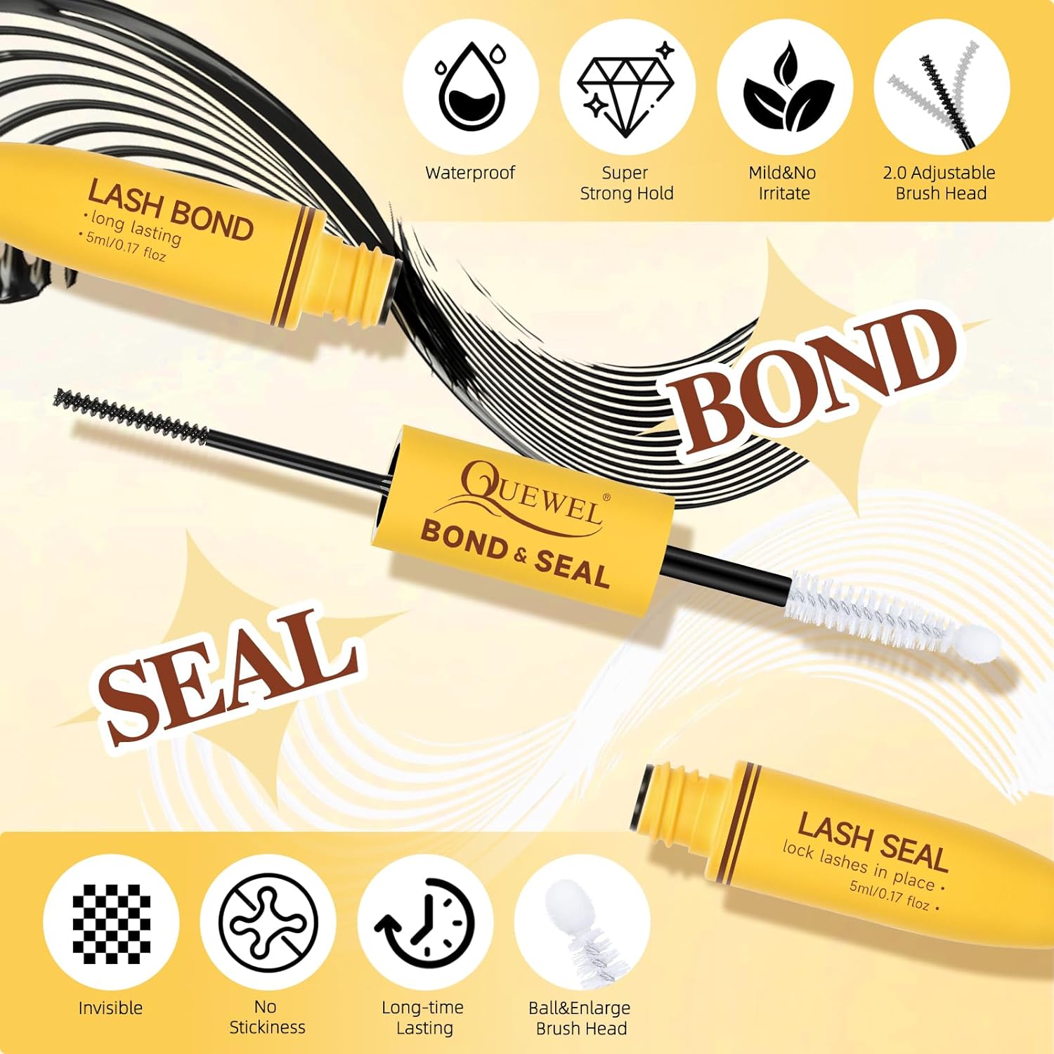 - Lasting Hold and Non-irritating: 2-in-1 lash bond and seal designed. On one side is lash bond with spiral mini individual lashes brush head, which makes each eyelash evenly brushed with lash cluster glue; on the other side is lash seal with the ball and enlarged brush head, which can effectively eyelash cluster longer. The upgraded formula is mild and non-irritating, and can also be used with confidence for sensitive eyes