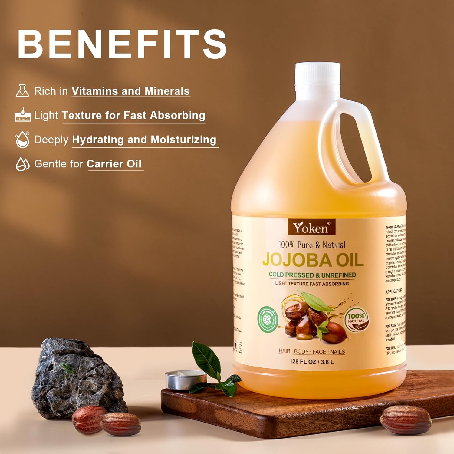 - Jojoba Oil Gallon Size: You will get jojoba oil 1 gallon / 128 fl oz, a great value bulk size for meeting all your DIY skincare needs, jojoba oil for hair, skin, face & nails. Jojoba seed oil in a BPA-free & Phthalate-free bottle for better storage.