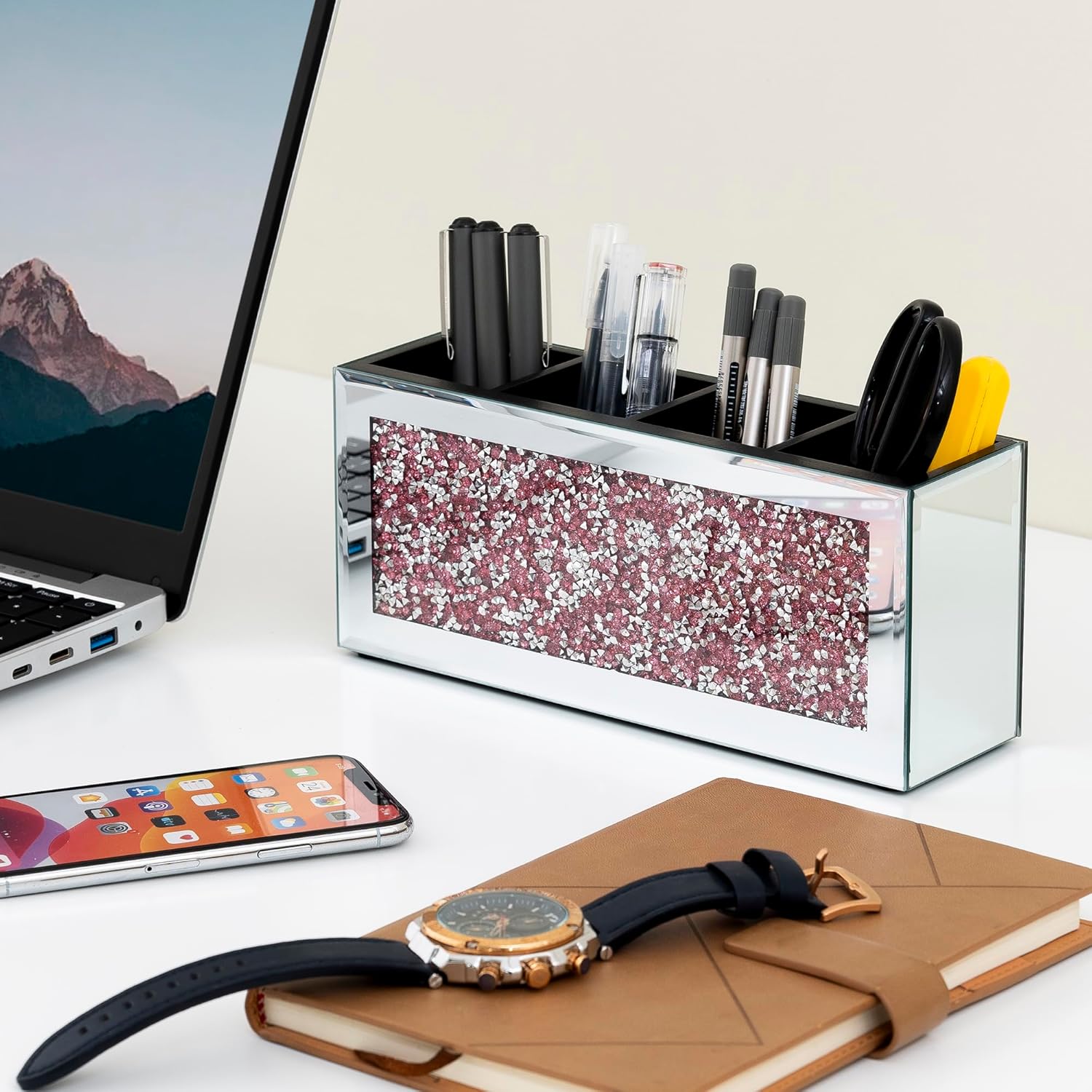 SHYFOY Mirrored Makeup Brush Holder, 4-Compartment Makeup Organizer with Pink Crushed Diamond, Vanity Cosmetics Organizer Solution, Pencil Holder Organizer for Desk