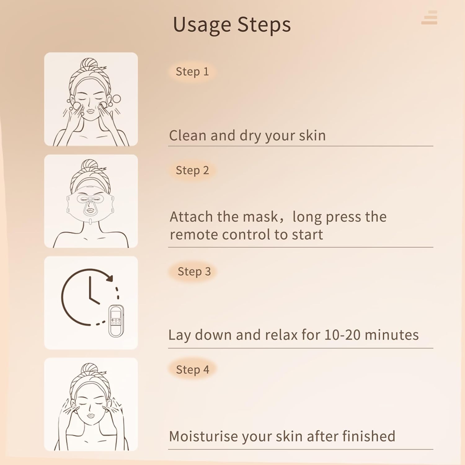 - Frequency of Use: Red light face mask requires regular use to maintain results. Recommended to use the device 3-4 times a week for up to 20 minutes each time. Tips Do not use while charging