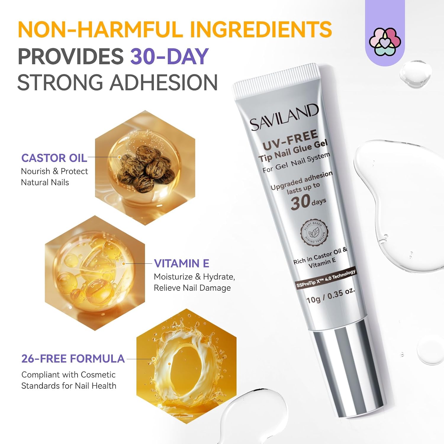 - 30-Day Ultra Long-Lasting: SAVILAND fake nail glue features a 26-free formula enriched with Castor Oil and Vitamin E. This formula not only provides a strong, long-lasting bond for up to 30 days but also helps nourish nails, preventing breakage, brittleness, dryness, curling, peeling, and splitting. A must-have for your manicure kit or cosmetics bag
