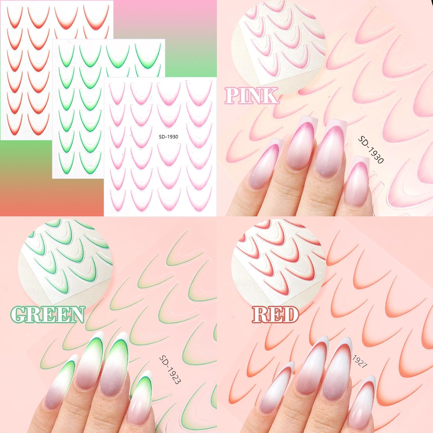 - ă3D Gradient French Tip StickersăYou will receive 12 sheets 3D French nail stickers in different colors, each with French line patterns of different sizes. Gradient French nail stickers and decal stripe designs combine popular elements, with simple design and rich colors, enough to satisfy your various French nail designs.