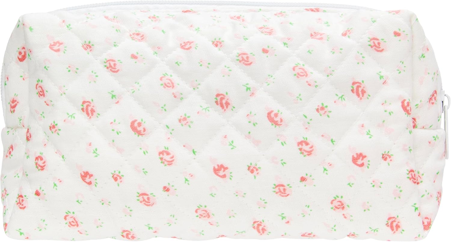 PAZIMIIK Vintage Quilted Makeup Bag Cosmetic Pouch for Brushes Pencils and Travel Make Up Accessories for Women and Girls Gauze Rose