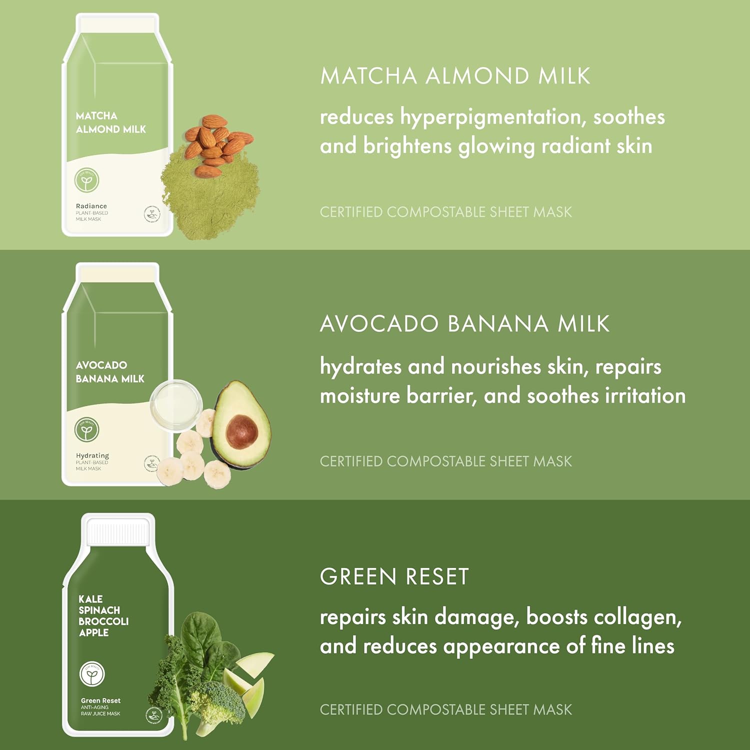 - Includes: Matcha Almond Milk, Green Reset, and Avocado Banana Milk Masks for plant-based hydration, radiance, and skin renewal