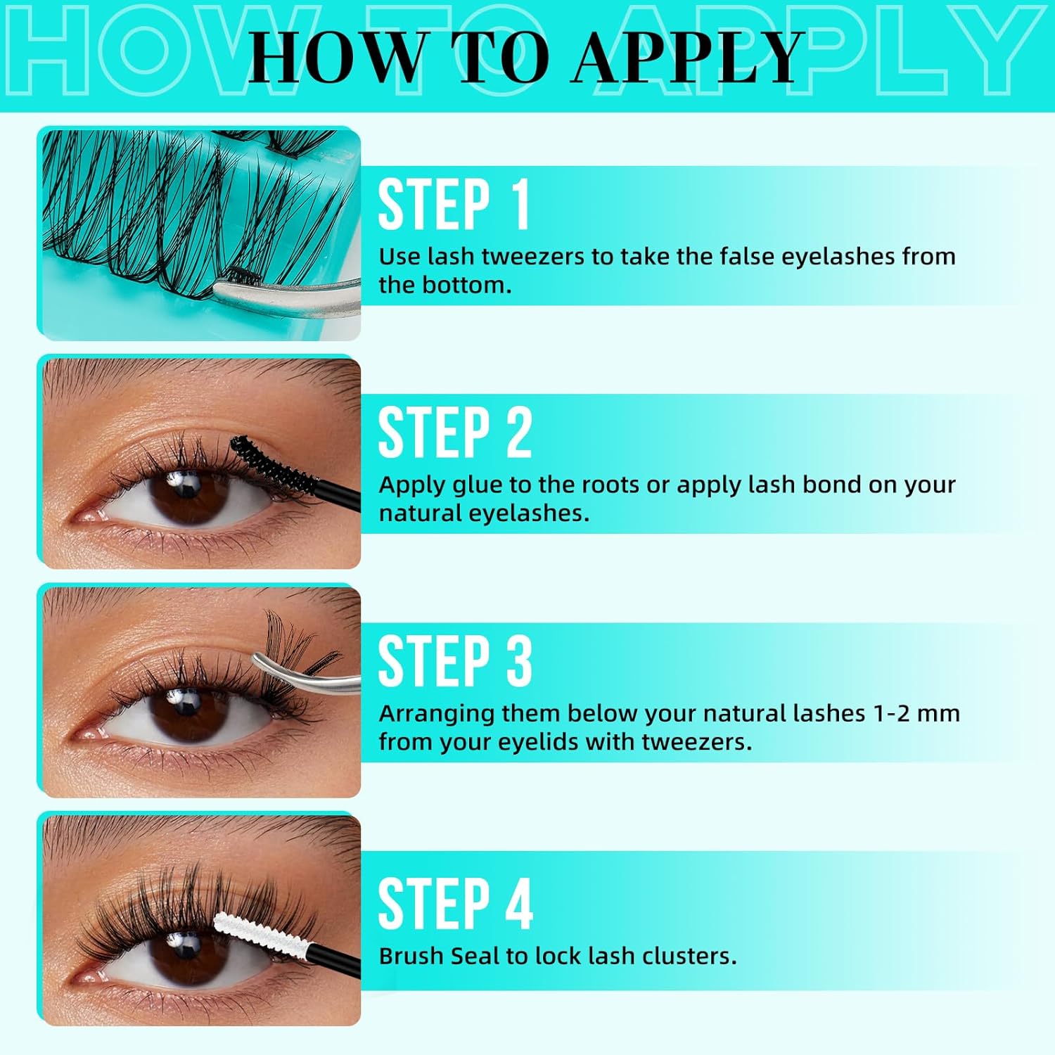 - Easy to Apply:Curl your lashes first,apply glue to the roots or apply lash bond on your natural eyelashes.Use lash tweezers to take the false eyelashes from the bottom.Match the wispy lash clusters to suit your style,arranging them below your natural lashes 1-2 mm from your eyelids,finally,use lash seal brush to lock.By 3 steps-bond,apply,seal,anyone can get stunning results.