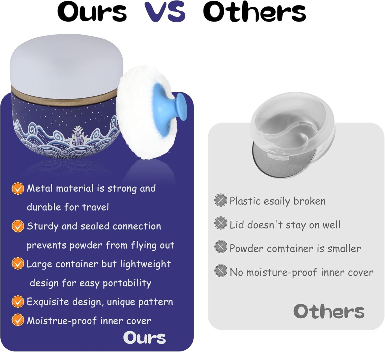 - Product contains a well-made powder case, a high quality powder puff with a handle and a small powder puff.