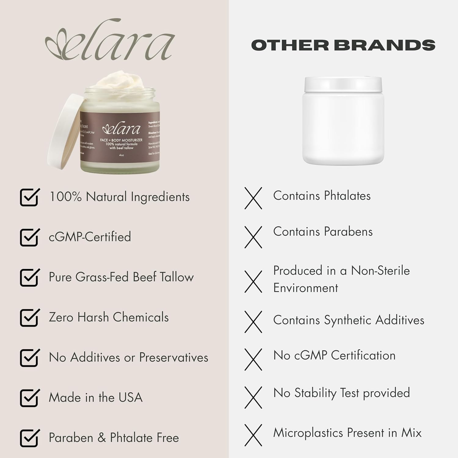 - NATURAL MOISTURIZER: Elara is a 100% natural grass fed beef tallow moisturizer for the face and body. It is packed with tallow's natural vitamins A, D, E, and K for skin nourishment. It is mixed with marula and sweet almond oil for a pleasant creamy texture. Beef tallow provides deep hydration to the skin.