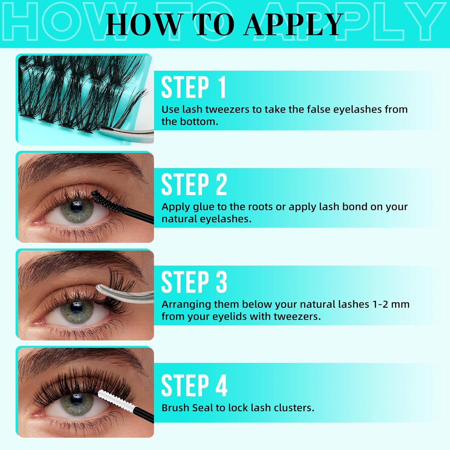 - Easy to Apply:Curl your lashes first,apply glue to the roots or apply lash bond on your natural eyelashes.Use lash tweezers to take the false eyelashes from the bottom.Match the wispy lash clusters to suit your style,arranging them below your natural lashes 1-2 mm from your eyelids,finally,use lash seal brush to lock.By 3 steps-bond,apply,seal,anyone can get stunning results.