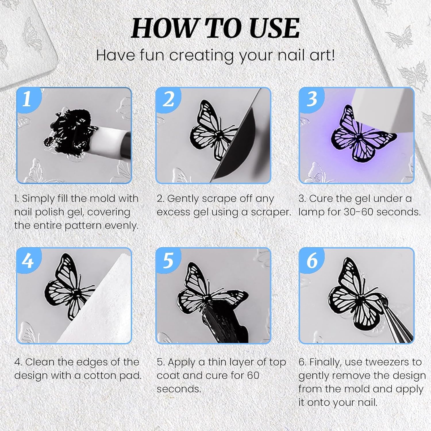 - 【EXQUISITE DESIGNS】The 3D Nail Art Sculpting Mould features a range of beautiful embossed designs, including beautiful butterflies, celestial moons and star rose sun bows. With these stunning designs, you can indulge your creativity and explore endless possibilities to add a touch of elegance and sophistication to your nail art.