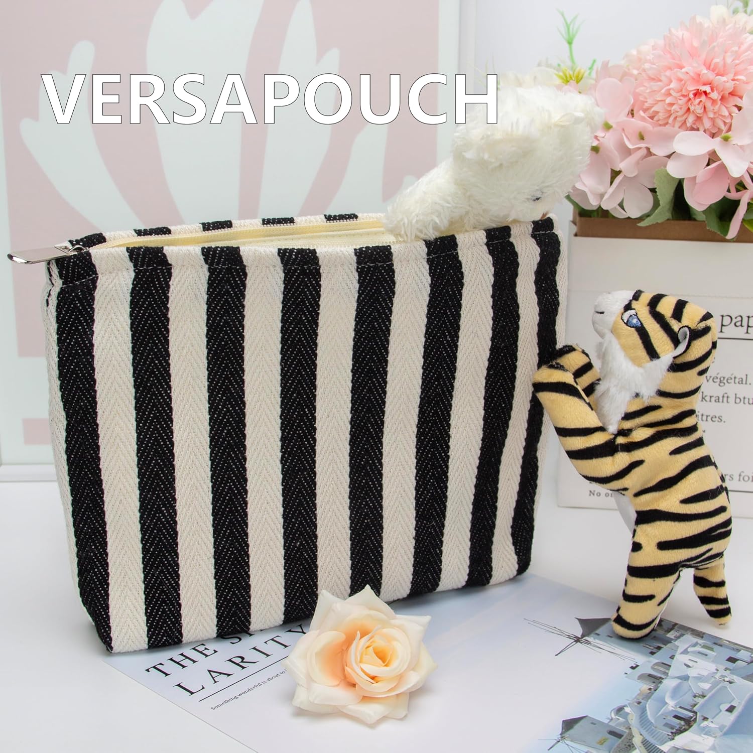 PAZIMIIK Makeup Bag Large Cotton Zipper Pouch for Purse Travel Canvas Make Up Organizer for Women Cosmetic,Stripe Black White