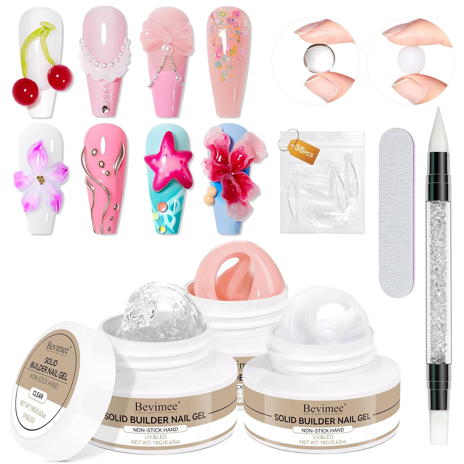 - Non-Stick 3D Molding Gel: You will get 3* hard gel, clear, white and nude, 18g/0.63oz per bottle; 36pcs dual nail forms, a nail file, a dual head nail art pen, and a user manual; Save your time and money to DIY at home, quickly builds the false nails without sticking to your hands.